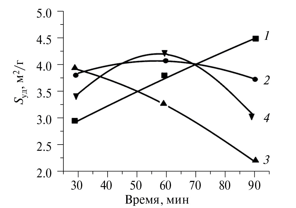 Рис. 7. Изменение удельной поверхности измельченного продукта в зависимости от отношения масс Ш : П: 1 – 5 : 1, 2 – 10 : 1, 3 – 15 : 1, 4 – 20 : 1, а также времени обработки; скорость вращения барабана – 300 об./мин.