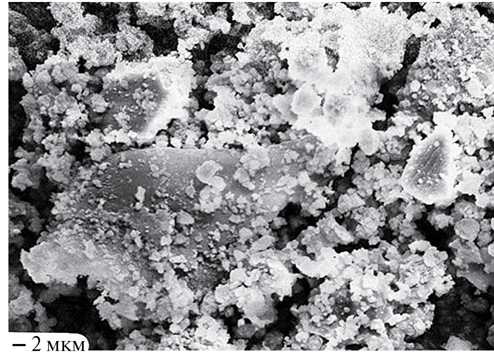 На рис. 11, 12 в виде РЭМ-изображений представлена морфология образцов, полученных с помощью планетарной мельницы в различных условиях измельчения. При скорости вращения 300 об./мин, соотношении Ш : П = 5 : 1 и продолжительности измельчения 60 мин (рис. 11) происходят заметные морфологические изменения частиц, уменьшение их размера до 1–3 мкм и осветление поверхности. При этом отмечена их склонность к образованию рыхлых агломератов. По мере увеличения подводимой энергии к измельчаемому материалу (рис. 12) наблюдается образование преимущественно плотных агломератов размером около 1 мкм. Величина удельной поверхности при этом понижается.