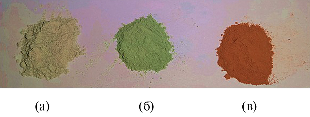 Рис. 15. Цвет пигментных наполнителей, полученных из измельченной минеральной смеси: а – исходный, б – с добавкой Cr2O3, в – с добавкой Fe2O3 (расход цветных модификаторов – 5 мас. %).