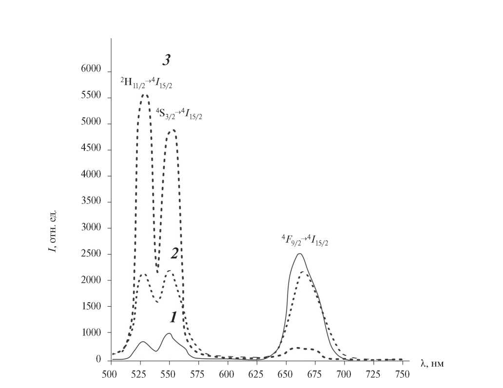 1 – 2х (2F5/2 – 2F7/2 (Yb3+) + (4I15/2 – 4I11/2, 4I11/2 – 4F7/2)/(4I15/2 – 4I11/2, 4I13/2 – 4F9/2) (Er3+), ап-конверсия;