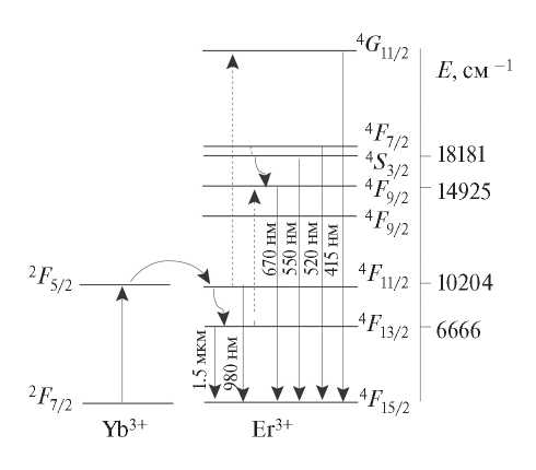 Рис. 3б. Схема реализации ап-конверсии в системе ионов Yb3+–Er3+ по данным [16].