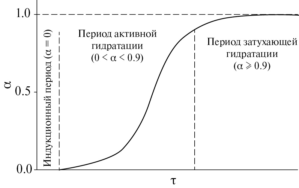 На рис. 1 показан общий вид зависимости степени гидратации (α) от времени (τ) в виде сигмоидальной кривой, на которой можно выделить три временных участка: индукционный (α = 0), активный (0 < α < 0.9) и затухающий (α ≥ 0.9). При добавлении β-CS̅H0.5 в воду происходит его растворение с последующим пересыщением водного раствора относительно ионов кальция и сульфат-ионов, которое начинается в течение индукционного периода. В свою очередь нуклеация и кристаллизация CS̅H2 происходят в течение периода активной гидратации, а развитие кристаллизационной структуры – в течение затухающего периода [6].