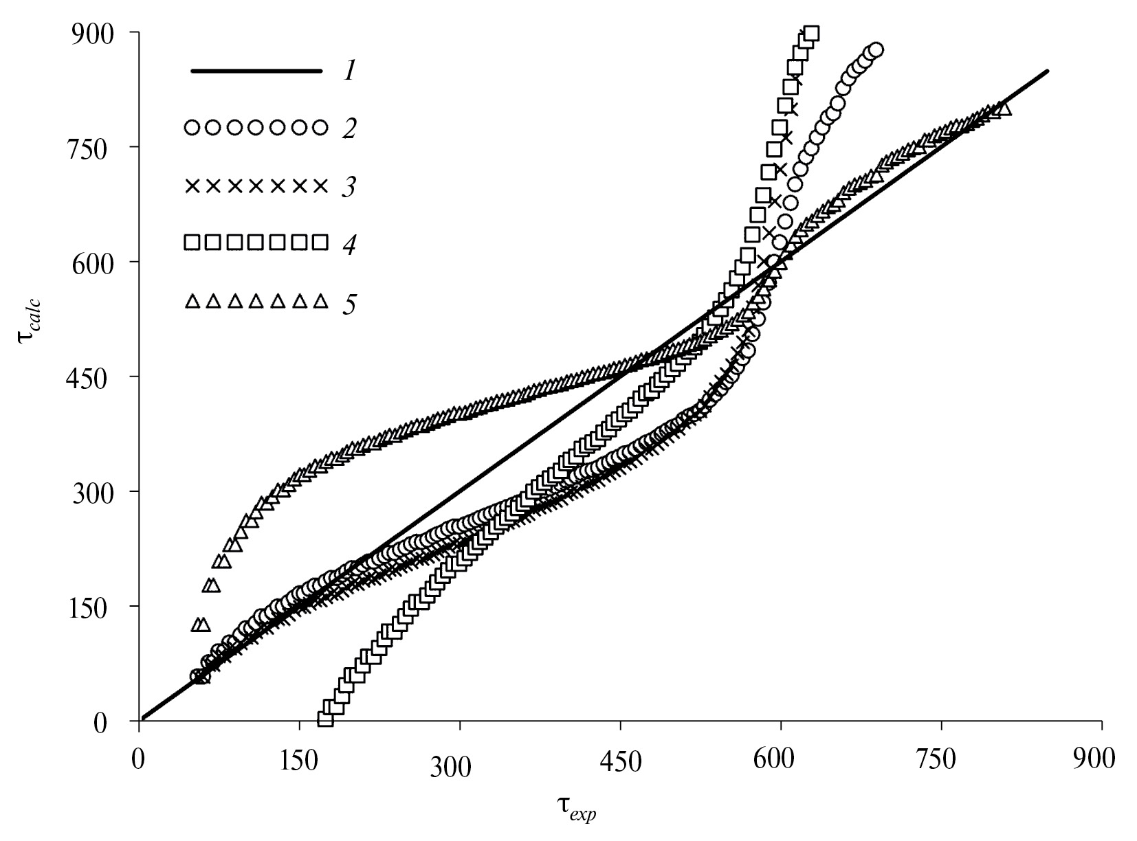 Рис. 5. Диаграмма корреляции времени τcalc = f(τexp): 1 – τcalc = τexp; 2, 3 – время, рассчитанное из выражений (16) и (17).