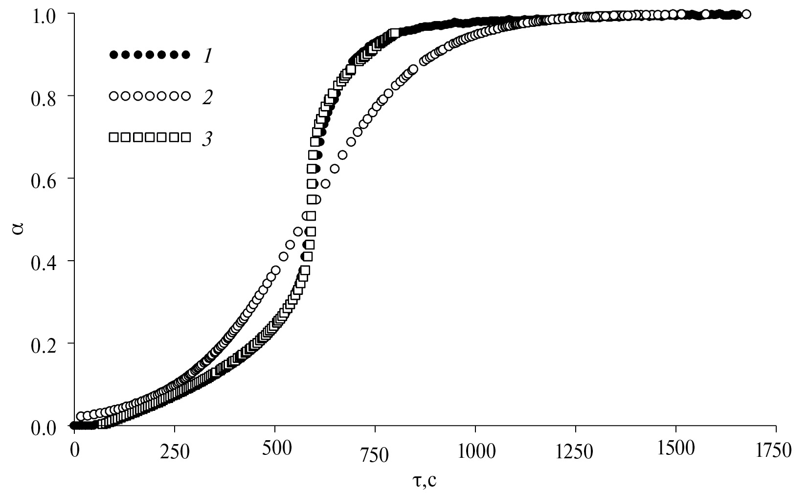 Рис. 6. Кинетические кривые гидратации β-CSH0.5 при 293 К: 1 – по данным эксперимента; 2, 3 – полученные из выражений (16) и (17).