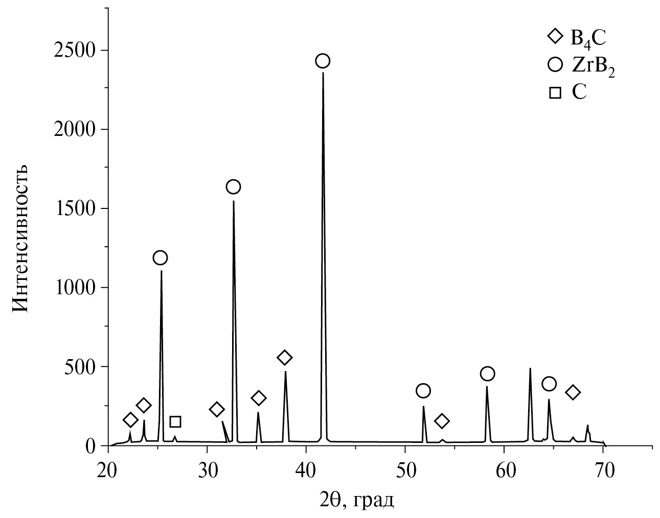 Рис. 2. Дифрактограмма образца В4С/10 мол.% ZrB2, реакционное ГП.