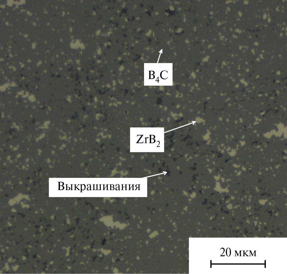 В составе образца, кроме целевых фаз В4С и ZrB2, обнаружено незначительное количество углерода. При загрузке шихты в пресс-форму поверхность пуансона, соприкасающаяся с образцом, прокладывается графитовой бумагой. Углерод, входящий в состав графитовой бумаги, мог проникнуть в объем образца и повлиять на результаты РФА. Мольное соотношение фаз B4C : ZrB2 : C составило 89 : 8 : 2.