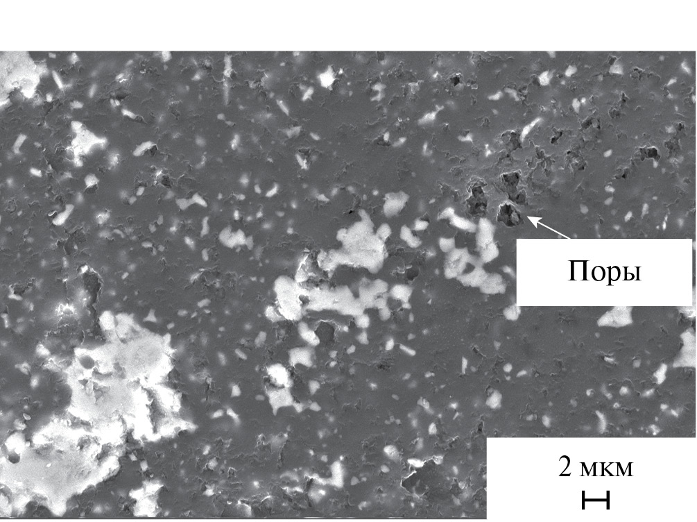 Для данного образца характерно наличие достаточно крупных агрегатов модифицирующей фазы размером до 80 мкм и пор размером до 8 мкм (рис. 6). Наличие пор и выкрашиваний в структуре материала может указывать на низкую прочность связи межзеренных границ.
