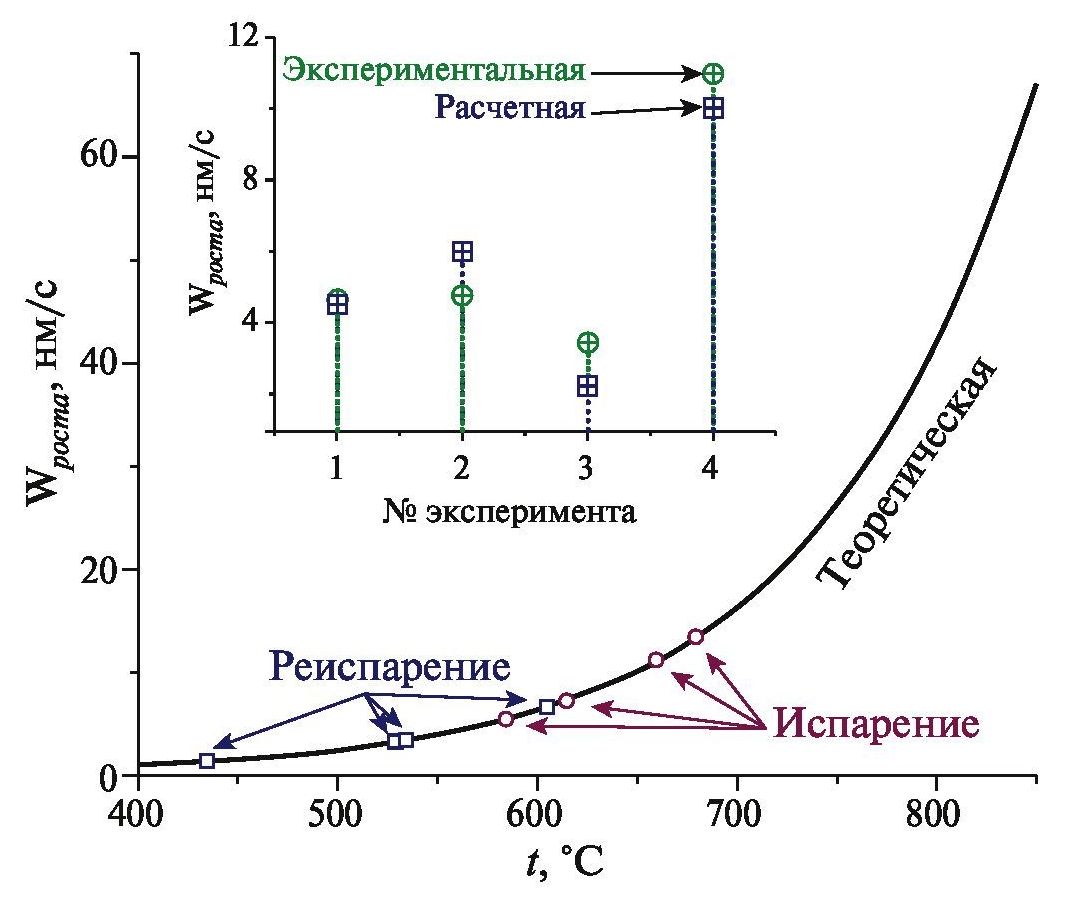 Результат расчета зависимости скорости роста от температуры испарения в диапазоне от 400 до 850°С представлен на рис. 1 черной сплошной линией. Ввиду того, что зоны конденсации паров имели достаточно высокие температуры, в расчетах также учитывался процесс испарения в горячей (“Испарение” на рис. 1) и в холодной (“Реиспарение” на рис. 1) зонах. На кривой красными кружками и синими квадратами обозначены скорости роста при температурах горячей и холодной зон соответственно, достигнутые в ходе экспериментов (табл. 1).