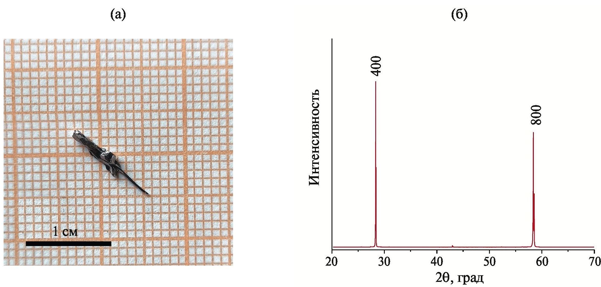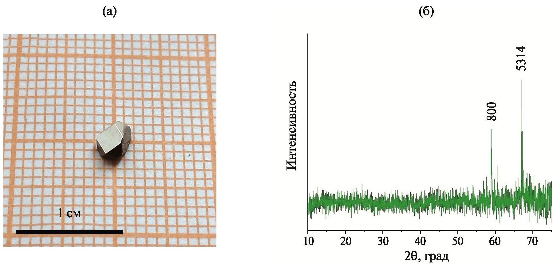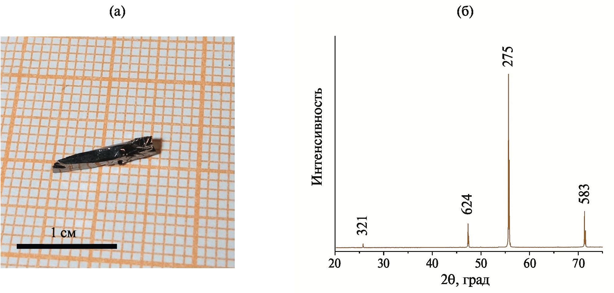 Эксперимент 3 проводился в существенно отличных технологических условиях. Так, масса шихты была увеличена до 24.94 г, а температура горячей зоны tисп была минимальной в рамках данной работы. При этом также был уменьшен температурный градиент, составивший 6.7°С/см, а время роста увеличено до 350 ч, согласно расчетам по данным массопереноса. Однако при этих технологических условиях не удалось получить единый монокристалл: в результате были получены хорошо ограненные пластинчатые монокристаллы размерами до 5 мм. Внешний вид и рентгенограмма этих кристаллов представлены на рис. 5.