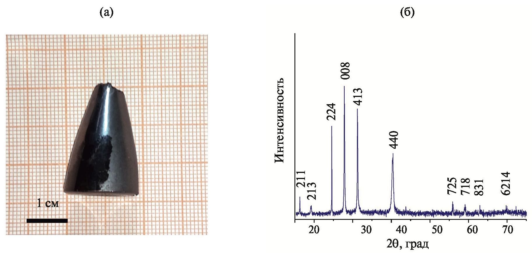 Выращивание монокристаллов проводили из предварительно синтезированного поликристаллического Cd3As2, полученного, согласно методике [31, 32], сплавлением высокочистых элементов кадмия и мышьяка, взятых в стехиометрическом соотношении. Идентификацию синтезированных слитков проводили с помощью рентгенофазового анализа (РФА). На рис. 2а и 2б представлены внешний вид синтезированного слитка и его порошковая рентгенограмма соответственно. Слиток имел высокую плотность и минимальную пористость. На рентгенограмме наблюдаются 30 пиков, соответствующих только фазе α-Cd3As2 (ICDD PDF-2 [01-089-2239], пр. гр. I41cd).