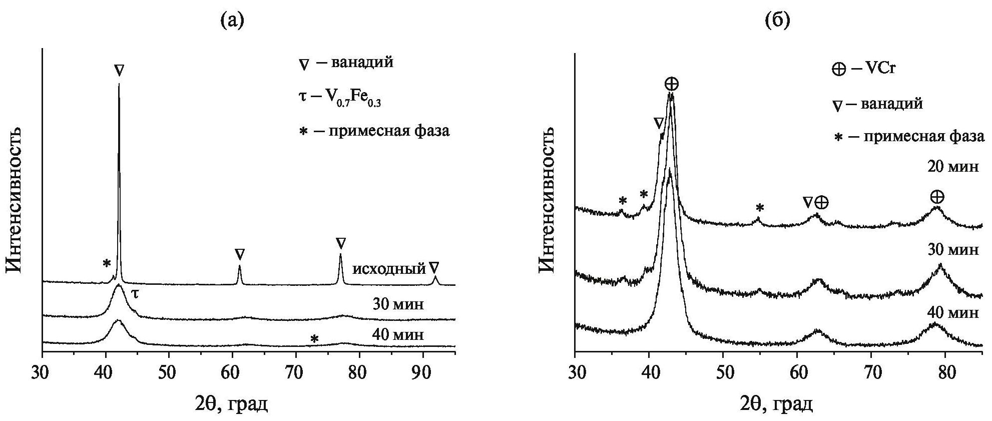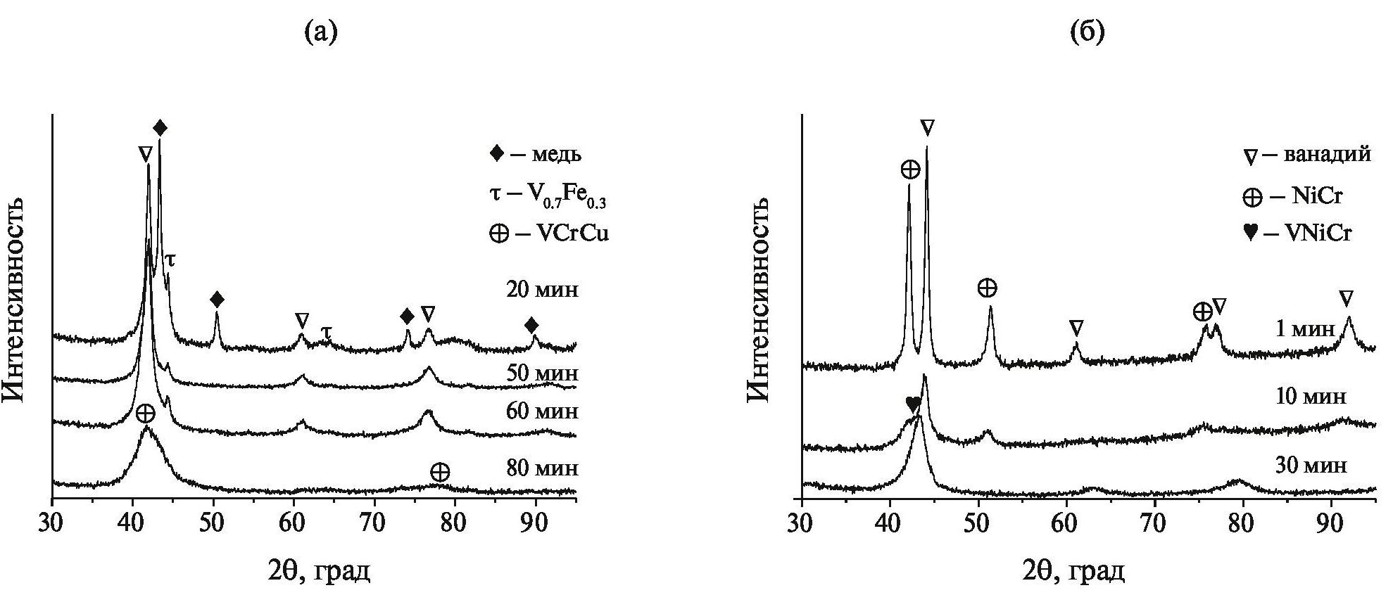 В работах [5, 14] было показано, что мембраны на основе таких сплавов обладают превосходной и стабильной водородопроницаемостью в течение как минимум 1000 ч при температуре 573 К без разрушения из-за охрупчивания. Дальнейшее увеличение времени МА до 80 мин приводит к аморфизации образца. На дифрактограмме сохраняется асимметричный широкий пик в области 41.8°, который свидетельствует о формировании двух твердых растворов – на основе ванадия и меди. С увеличением времени МА смеси порошков V и NiCr фаза металлического ванадия исчезает (рис. 3б), а после 10 мин обработки начинает формироваться новый твердый раствор с кубической структурой.