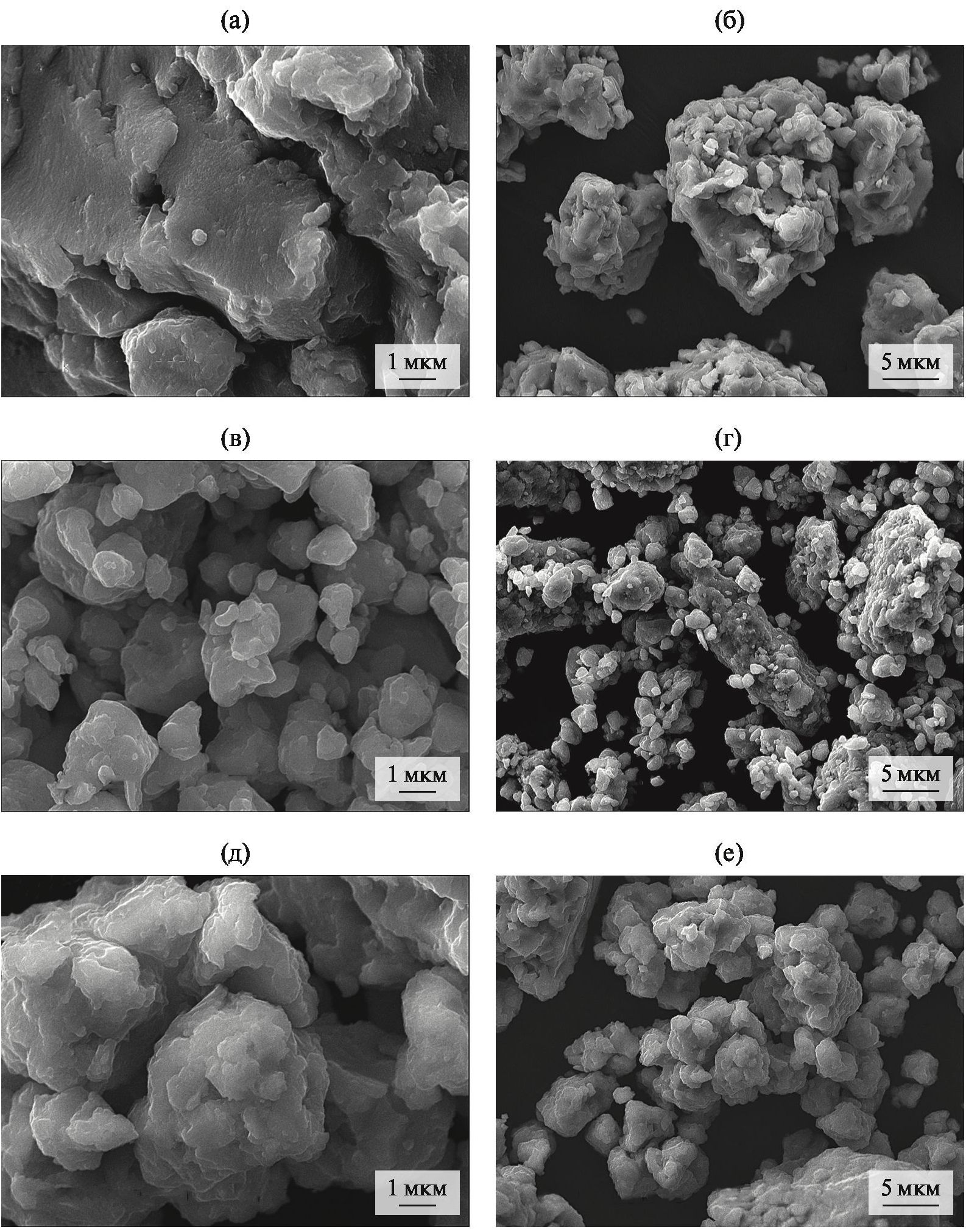 Рис. 4. Микрофотографии образцов после 20 мин МА: а, б – V70Cr30; в, г – (V95Cr5)70Cu30; после 30 мин МА: д, е – V70(Ni80Cr20)30.