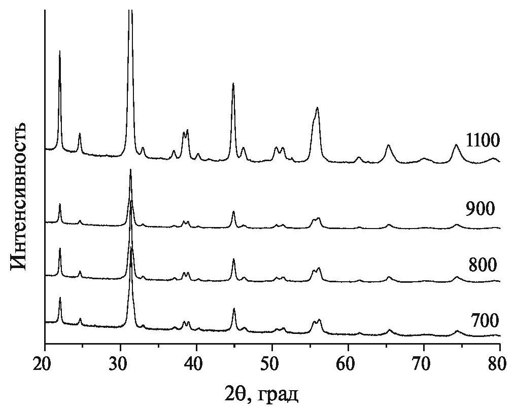 Рис. 5. Дифрактограммы образцов La0.96Sr0.04ScO3, прокаленных при 700–1100°С на воздухе.