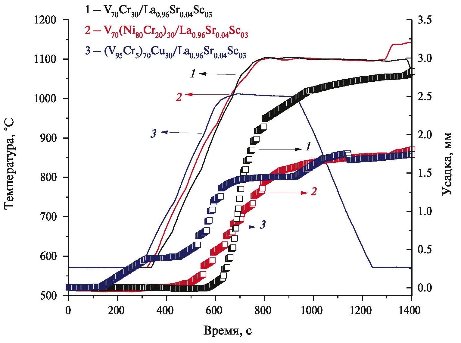 Фазовый состав и микроструктура композитов. Для синтеза композитов использовали сплавы V70Cr30, V70(Ni80Cr20)3 после 30 мин МА и (V95Cr5)70Cu30 после 80 мин МА. На рис. 6 представлены термограммы процесса ЭИС композитов. Анализ представленных кривых спекания показывает, что усадка порошков происходит в интервале температур 850–1100°С. Для композитов V70(Ni80Cr20)30/La0.96Sr0.04ScO3 (VNC/LSS) и V70Cr30/La0.96Sr0.04ScO3 (VC/LSS) зависимости имеют стадийный характер: стадия медленной усадки при ~800 и 950°С соответственно и стадия интенсивной усадки порошков в интервале нагрева до 1100°С и выдержке в течение 10 мин. Введение в сплав V–Cr никеля снижает температуру начала усадки.