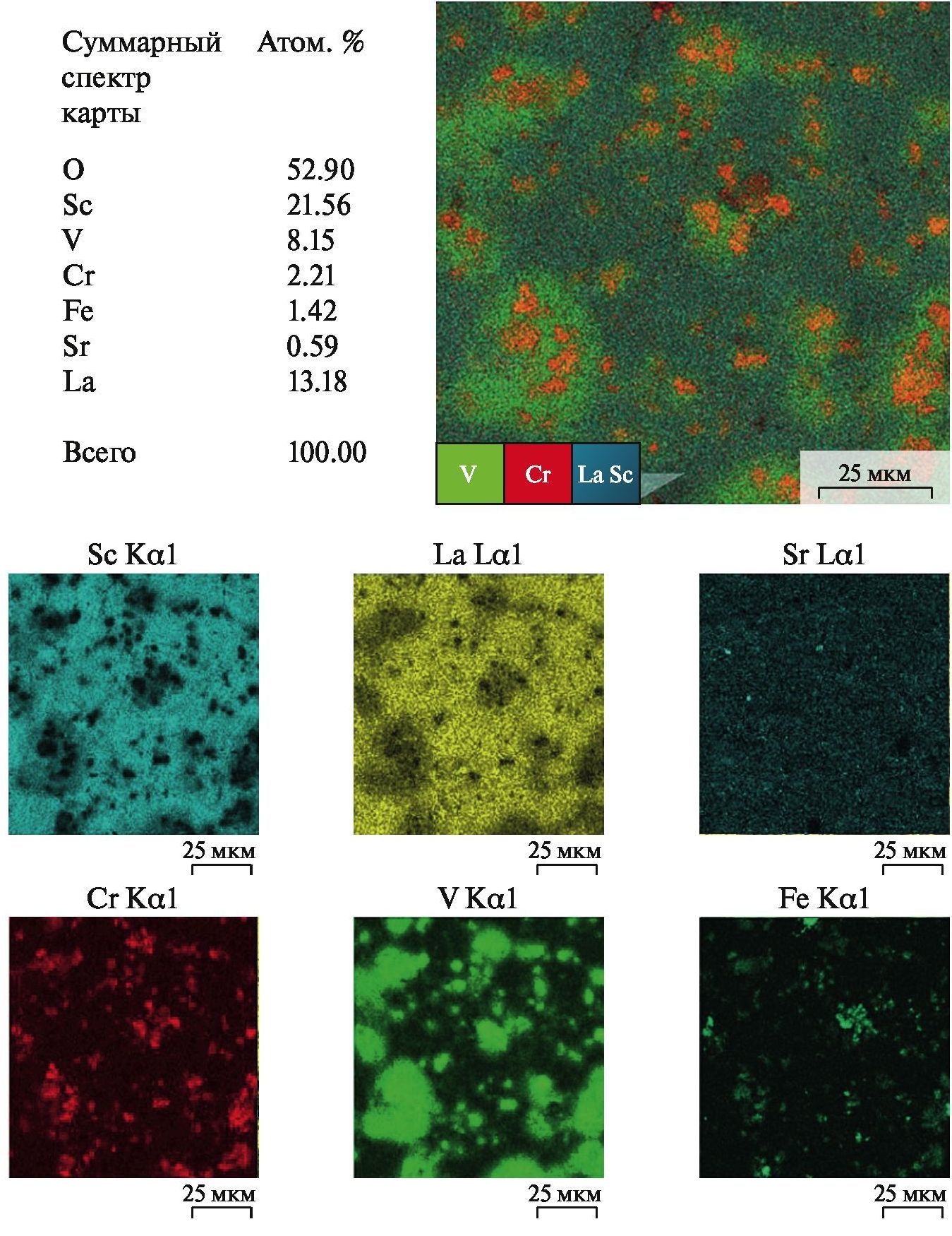 На снимках СЭМ (рис. 8а–г) поверхность обоих композитов отличается равномерным распределением фаз с четкими границами раздела. Отсутствие пор и трещин свидетельствует о высокой степени консолидации частиц металлической фазы и фазы перовскита, необходимой для проводящей мембраны. Микродефекты, присутствующие на поверхности, возникли в процессе стирания углеродной фольги, технологически требуемой, чтобы образец не припекался к пресс-форме. Элементное картирование поверхности VC/LSS показало присутствие железа после спекания композита, которое сегрегируется в местах скопления ванадия и хрома, с вероятным образованием сплава (рис. 9). Как говорилось выше, присутствие железа в образце является результатом намола в процессеМА.