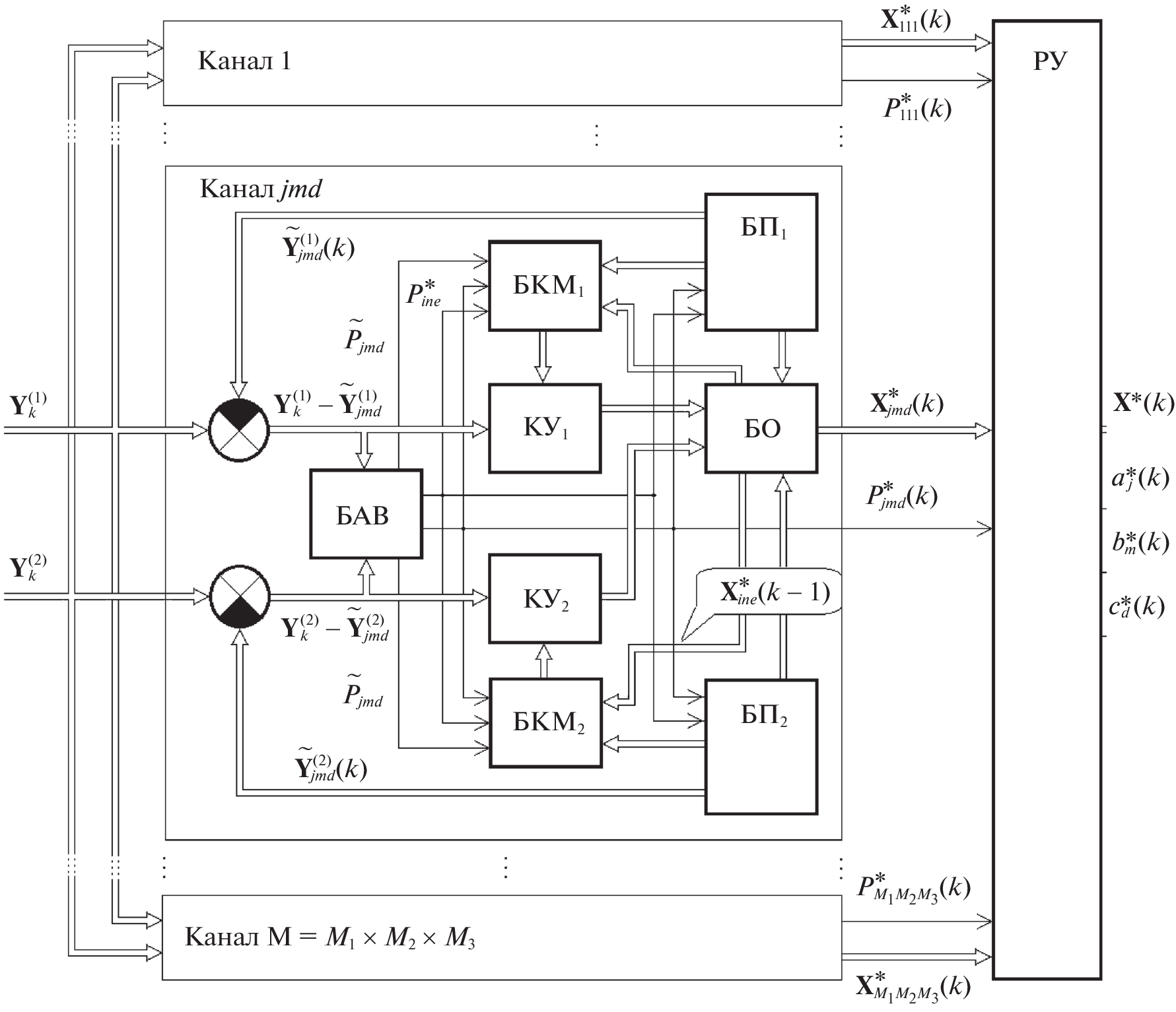 Методами марковской теории оценивания случайных процессов решена задача синтеза оптимальных и квазиоптимальных алгоритмов комплексной обработки информации при сопровождении маневрирующего объекта и двухканальном векторном наблюдении с нарушениями в статистически неопределенных ситуациях. Задача решена применительно к дискретно-непрерывному марковскому процессу для случая, когда его непрерывная часть представляет собой векторную марковскую последовательность, а дискретная часть характеризуется трехкомпонентным дискретным марковским процессом, каждая компонента которого описывается цепью Маркова на несколько положений. Приводится структурная схема квазиоптимальной комплексной обработки информации. На простом примере методом имитационного моделирования показана работоспособность квазиоптимального алгоритма в статистически неопределенных ситуациях.