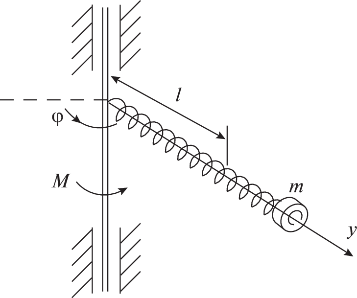 Рассматривается задача оптимального по быстродействию поворота системы с двумя степенями свободы в виде материальной точки на пружине, совершающей колебания вдоль жесткого невесомого стержня, который вращается в горизонтальной плоскости. Внешний управляющий момент приложен к оси вращения стержня и ограничен по модулю, трение отсутствует. Решается задача наибыстрейшего поворота стержня на заданный угол из состояния покоя с гашением колебаний. Особенность нелинейной системы в том, что ее линеаризованная (в окрестности состояния покоя) модель не является управляемой.