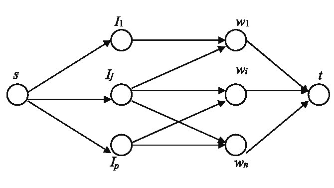 Пусть — все различные величины , , . Строится потоковая сеть (см. рисунок), где —множество вершин, u — источник, v — сток, ( — множество ориентированных дуг. Дуга вводится в сеть, если . Отметим, что при всех j и i либо , либо . Пропускные способности U Î дуг определяются следующим образом: , , ( .