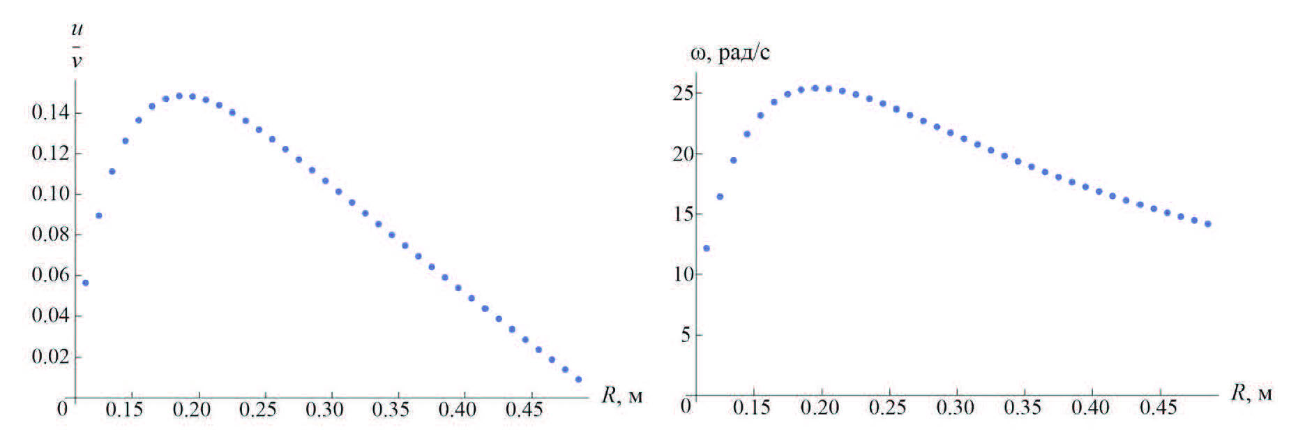 На рис. 7 при фиксированном rw построены бифуркационные диаграммы, отражающие зависимость приведенной скорости корпуса (u / v) и угловой скорости вала от радиуса ротора Савониуса R. При дальнейшем изложении в целях упрощения считаем, что R зафиксировано и равно 0.195 м.