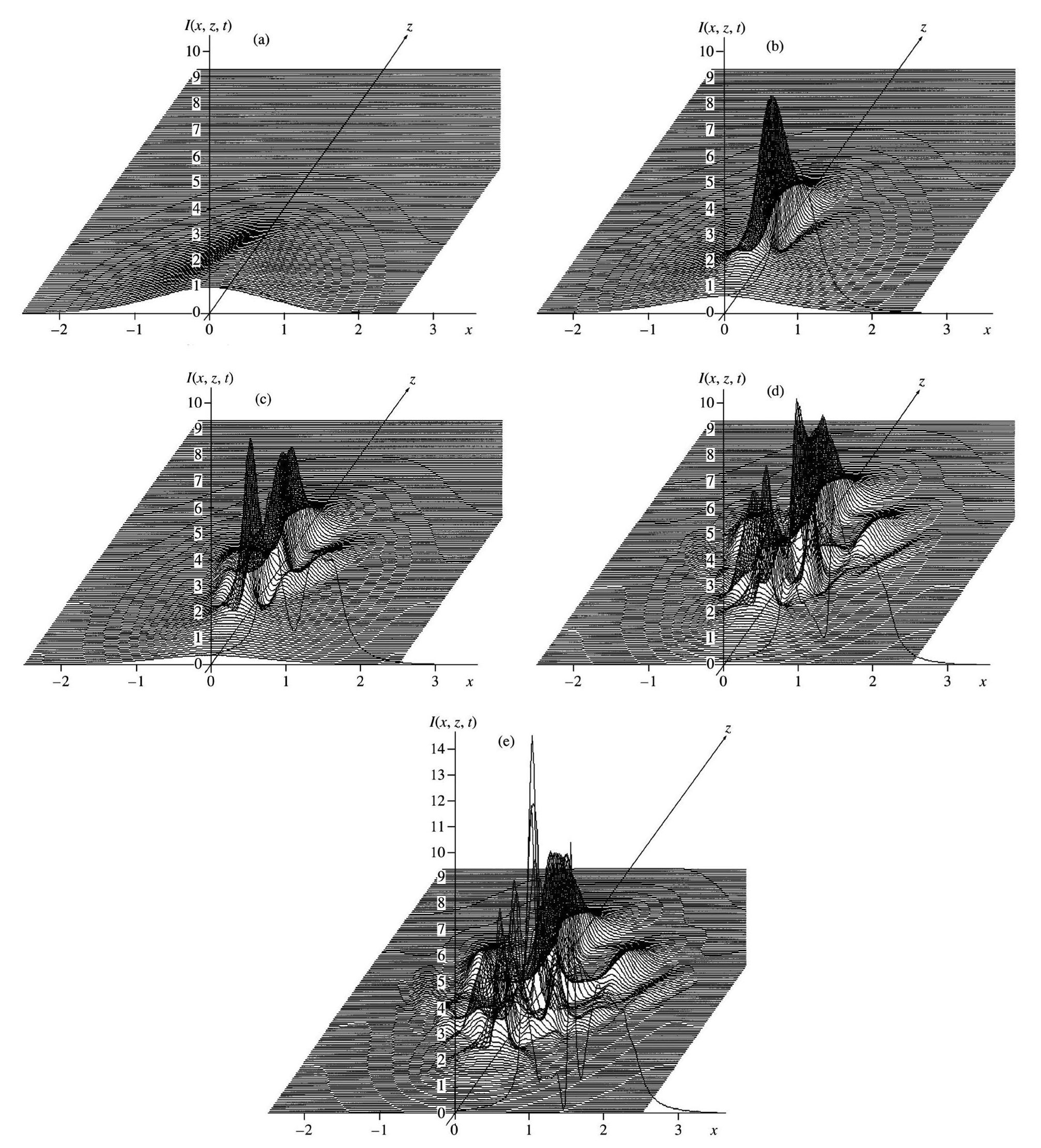 Рис. 1. Иллюстрация динамики интенсивности «плоского» импульса I(x, z, t) при одинаковых значениях параметров задачи α, β, γ, δ, ν в разные моменты времени: (a), (b), (c), (d), (e)