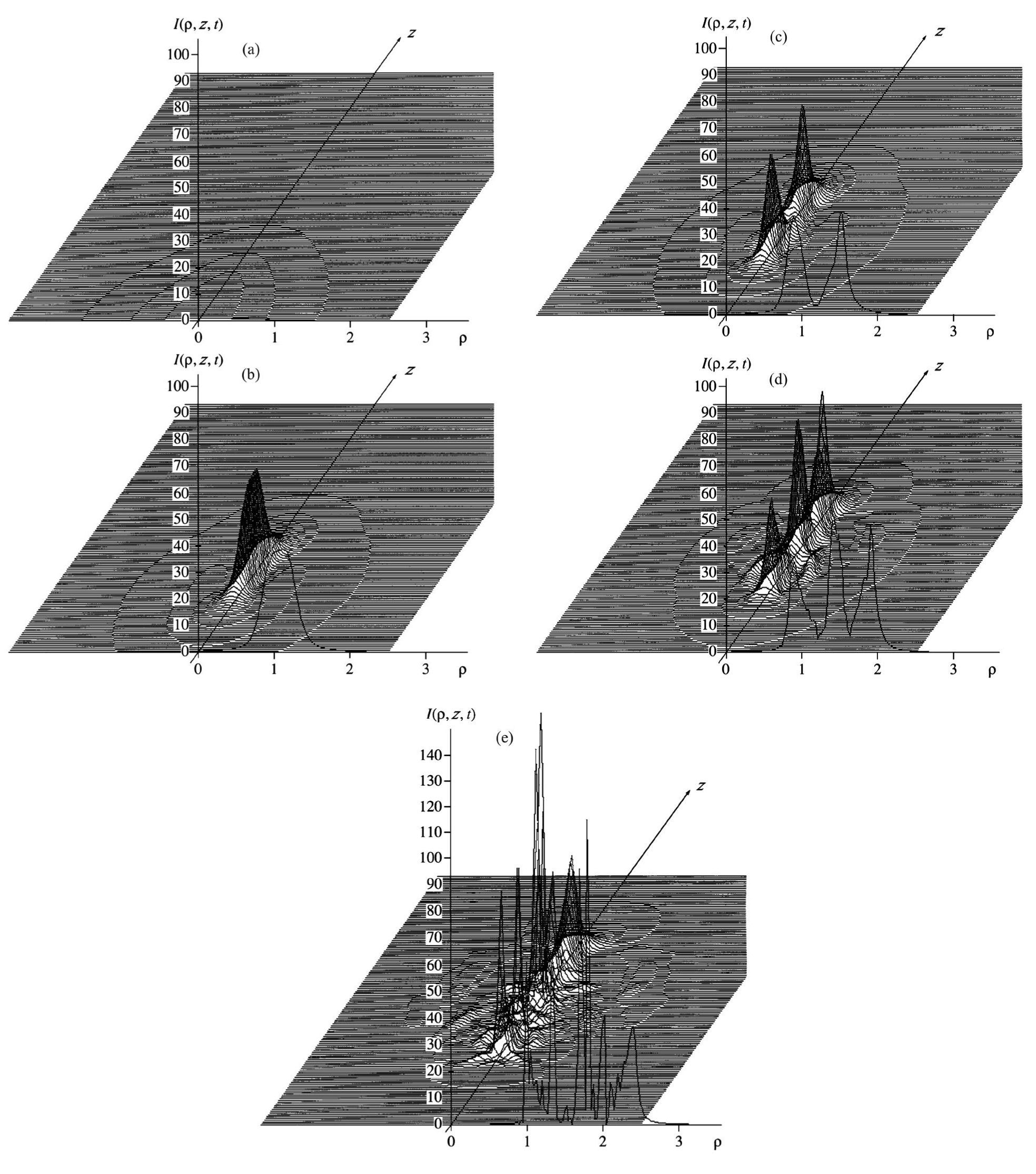 Рисунок 2 иллюстрирует исследуемый процесс в случае объемных, цилиндрических импульсов. Трехмерные графики интенсивности цилиндрического импульса I(ρ, z, t) соответствуют следующим моментам времени: