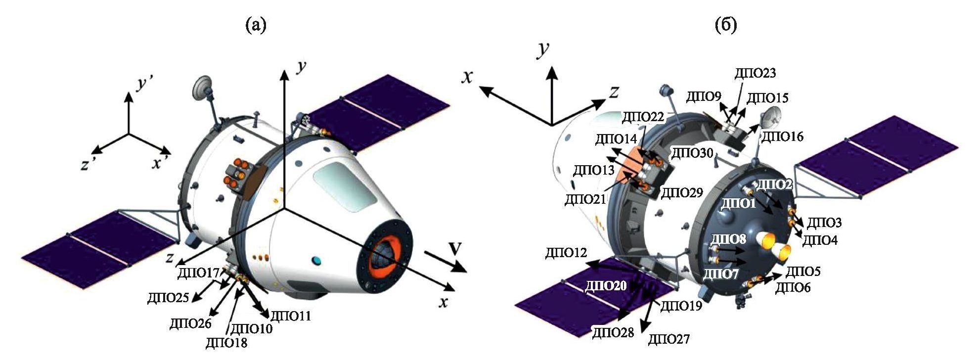 Для перемещений центра масс аппарата и его вращения с помощью ракетных двигателей управление осуществляется с использованием широтно-импульсной модуляции длительности включения двигателей. Все ДПО распределены по поверхности двигательного отсека ПТК для обеспечения возможности создания управляющих воздействий по любому из 12 каналов управления (6 пространственных и 6 угловых). На рис. 1 черными стрелками для каждого ДПО изображены направления истечения продуктов сгорания. Направление тяги, создаваемой ДПО, имеет соответственно противоположное направление. Двигатели расположены в восьми блоках, которые образуют три пояса двигателей. Первый пояс находится на донном экране двигательного отсека и состоит из восьми ДПО (ДПО1-ДПО8 на рис. 1,б). Указанный набор двигателей используется для перемещения в направлении +X и создания моментов в каналах рысканья и тангажа. Средний пояс размещен вблизи положения центра масс на продольной оси ПТК и состоит из восьми ДПО (ДПО23-ДПО30 на рис. 1). Данные двигатели создают небольшие управляющие моменты (по сравнению с ДПО донного торца) и применяются в основном для перемещений в боковых каналах ±Y и ±Z. Наконец, передний пояс расположен ближе к возвращаемому аппарату и состоит из 14 ДПО (ДПО9-ДПО22 на рис. 1). Предназначение двигателей данного пояса: обеспечение перемещения в направлении –X и создание моментов в каналах тангажа и рысканья (ДПО9-ДПО14 на рис. 1) и в канале крена (ДПО15-ДПО22 на рис. 1). Двигатели разделены на два гидравлических коллектора (в одном – 14 ДПО в другом – 16 ДПО), каждый из которых отдельно позволяет решать поставленную задачу управления пространственным движением ПТК. В качестве основного варианта управления рассматривается одновременное использование всех 30 ДПО. Одной из проблем при формировании управляющих длительностей включения двигателей является то обстоятельство, что направления тяг подавляющего большинства двигателей не совпадают ни с каналами измерителя угловой скорости, ни с направлениями осей связанной системы координат ПТК. В основном практически все двигатели создают воздействия сразу по всем каналам управления, что затрудняет возможности их комбинирования для формирования управляющего воздействия только по одному или нескольких выбранным каналам.