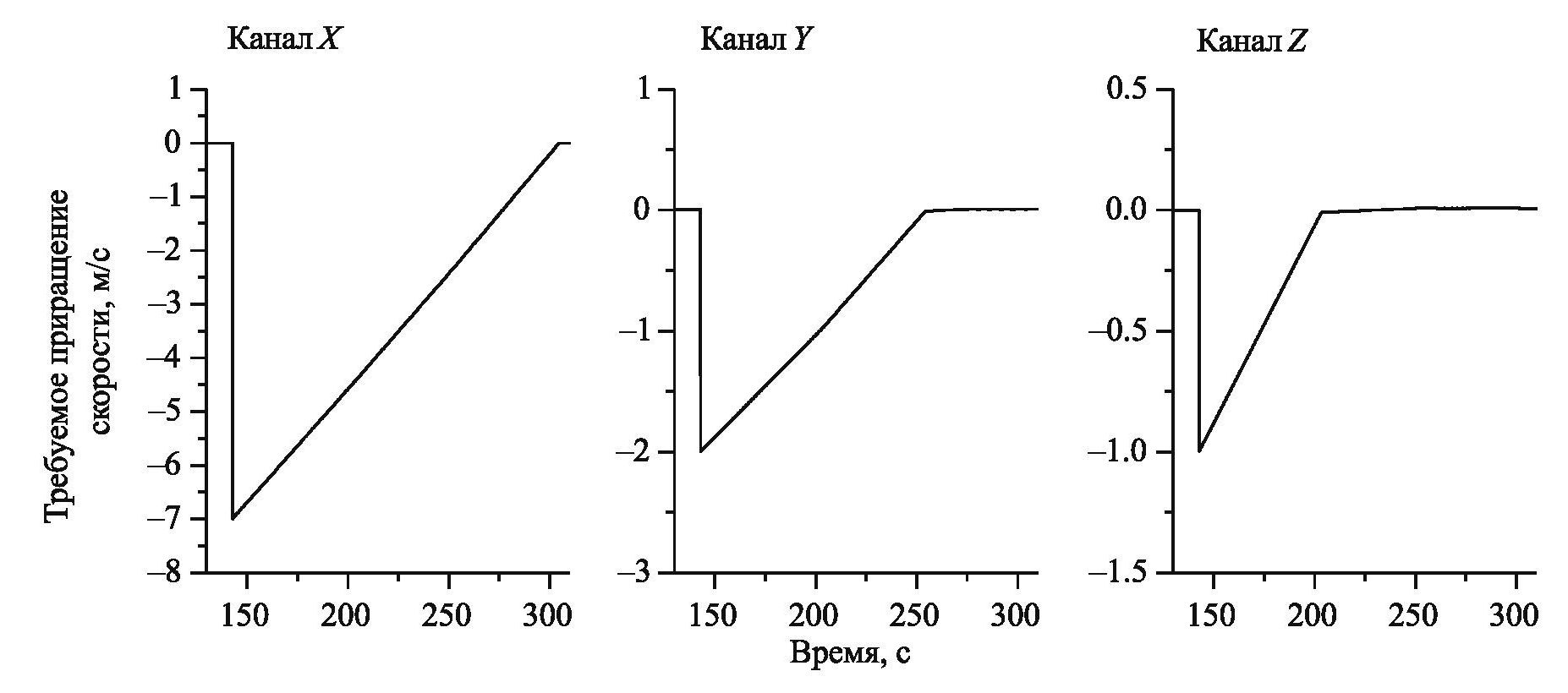 На рис. 4 изображено поведение угловых скоростей и рассогласований в каналах крена, рысканья и тангажа при выполнении коррекции орбиты по декартовой схеме с импульсом величиной . Причем реализация его компоненты вдоль продольной оси и стабилизация в каналах тангажа и рысканья осуществляется четырьмя хвостовыми ДПО первого коллектора (ДПО1, ДПО3, ДПО5, ДПО7), управление в боковых каналах – включением ДПО среднего пояса, а для управления в канале крена используются ДПО переднего пояса ДПО17, ДПО18, ДПО21, ДПО22. На рис. 5 изображено поведение требуемых приращений скорости в линейных каналах в проекциях на оси связанного базиса. Из приведенных графиков видно, что в процессе управления угловое рассогласование не превышает 0.8°, а угловая скорость не превышает границ зоны нечувствительности, составляющих 0.12 град/с.