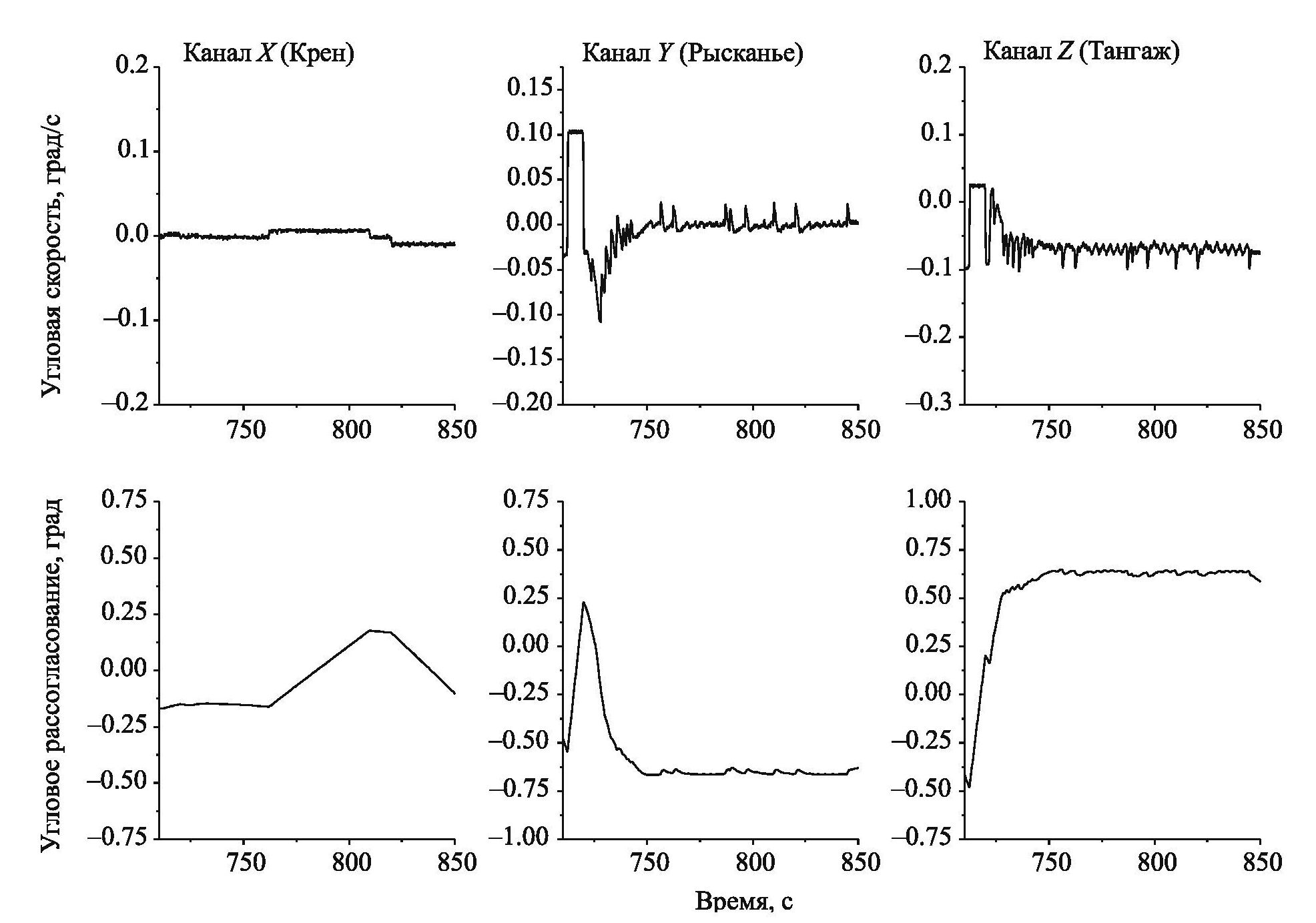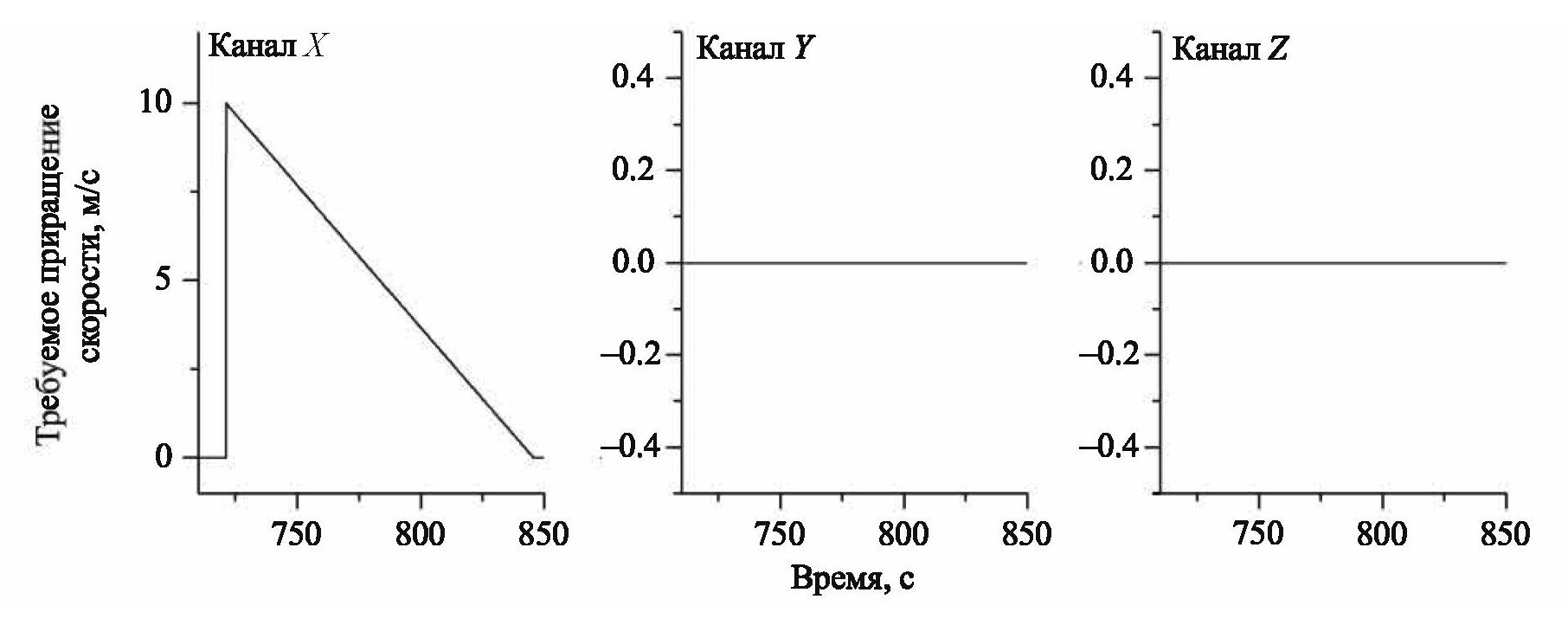Крайне интересным представляется также рассмотреть пример коррекции орбиты по полярной схеме с использованием всех восьми ДПО донного экрана. Данный режим предполагается достаточно часто применять в полете, ввиду того что в этом режиме на осаждение топлива в баках низкого давления перед включением МД требуется минимальное время, что делает необходимым включение восьми ДПО донного экрана перед каждым включением МД. Дополнительно данный режим является резервным вариантом выдачи спускового импульса для обеспечения посадки возвращаемого аппарата и основным вариантом коррекции орбиты при автономном полете двигательного отсека после отделения от него возвращаемого аппарата. На рис. 10 изображено поведение угловых скоростей и угловых рассогласований в каналах крена, рысканья и тангажа при реализации коррекции орбиты по полярной схеме с импульсом величиной . Причем компонента импульса вдоль продольной оси и стабилизация в каналах тангажа и рысканья осуществляется восемью ДПО донного экрана, входящими в состав сразу обоих гидравлических коллекторов (ДПО1-ДПО8), управление в боковых каналах при реализации импульса по полярной схеме не осуществляется. Для управления в канале крена, как и ранее, используются ДПО переднего пояса ДПО17, ДПО18, ДПО21, ДПО22. На рис. 11 рассмотрено поведение требуемых приращений скорости в линейных каналах в проекциях на оси связанного базиса. Из приведенных графиков видно, что в процессе управления угловое рассогласование не превышает 0.8°, а угловая скорость незначительно превосходит границы зоны нечувствительности, составляющие 0.12 град/с только в момент включения всех ДПО донного экрана, что находится в допустимых пределах.