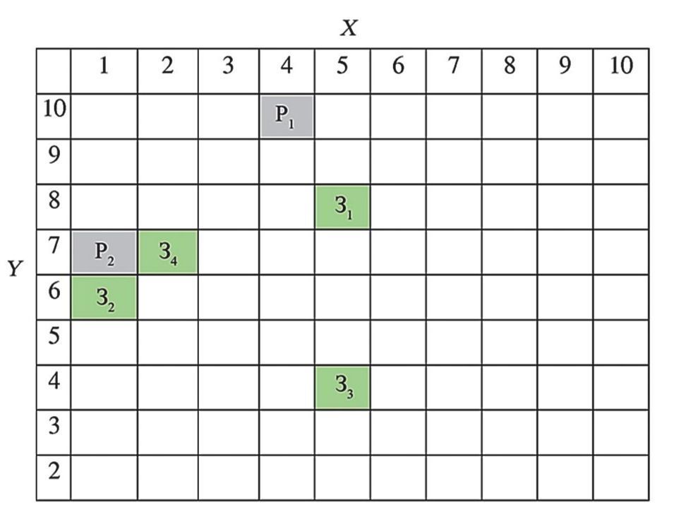 - Постановка задачи в виде TSP (travelling salesman problem, задача коммивояжера). Для эффективного синтеза алгоритмов управления группой роботов целесообразно представить всю группу роботов и задания на поле в виде вершин графа, что является необходимым и достаточным условием [13]. В качестве демонстрации процесса перехода от исходной задачи к TSP-задаче на графе рассмотрим частный случай, когда мобильная группа состоит из двух роботов (Р1, Р2) и необходимо выполнить четыре задания (З1, З2, З3, З4). Объекты размещаются на дискретном рабочем поле 10 × 10. Начальные координаты роботов и координаты заданий показаны в табл. 1, на рис. 1 – их графическое расположение на дискретном рабочем поле.