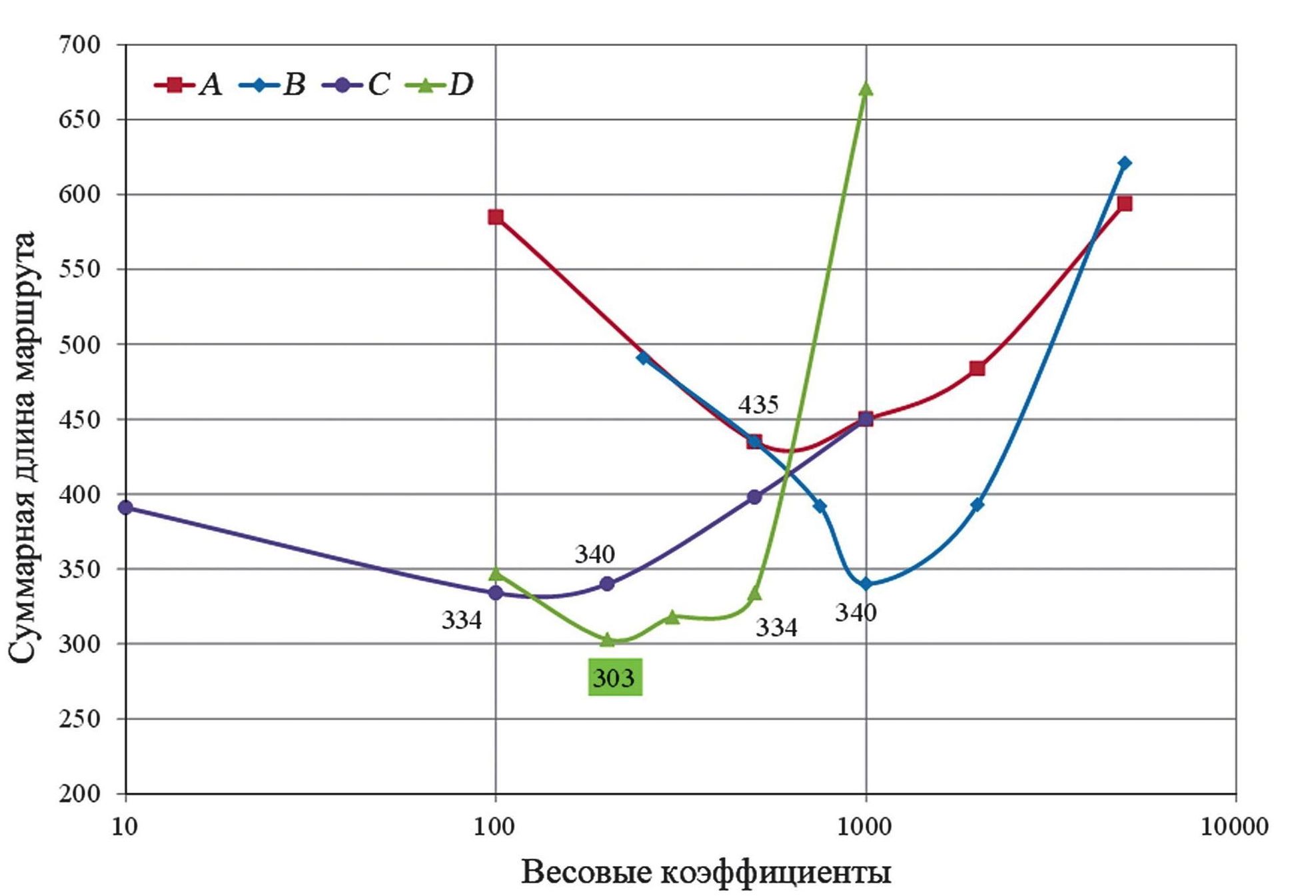 Этап 2. Для быстрой сходимости веса A, B, C, D задаются в диапазоне 100–1000 единиц. Практические исследования показали, что при таких параметрах оптимизация наиболее эффективна. Проверим, какие параметры будут наиболее применимы для текущей размерности сетевой модели. Для этого проведем последовательную метаоптимизацию по весовым критериям. Ход оптимизации приведен в табл. 2 и на рис. 7.