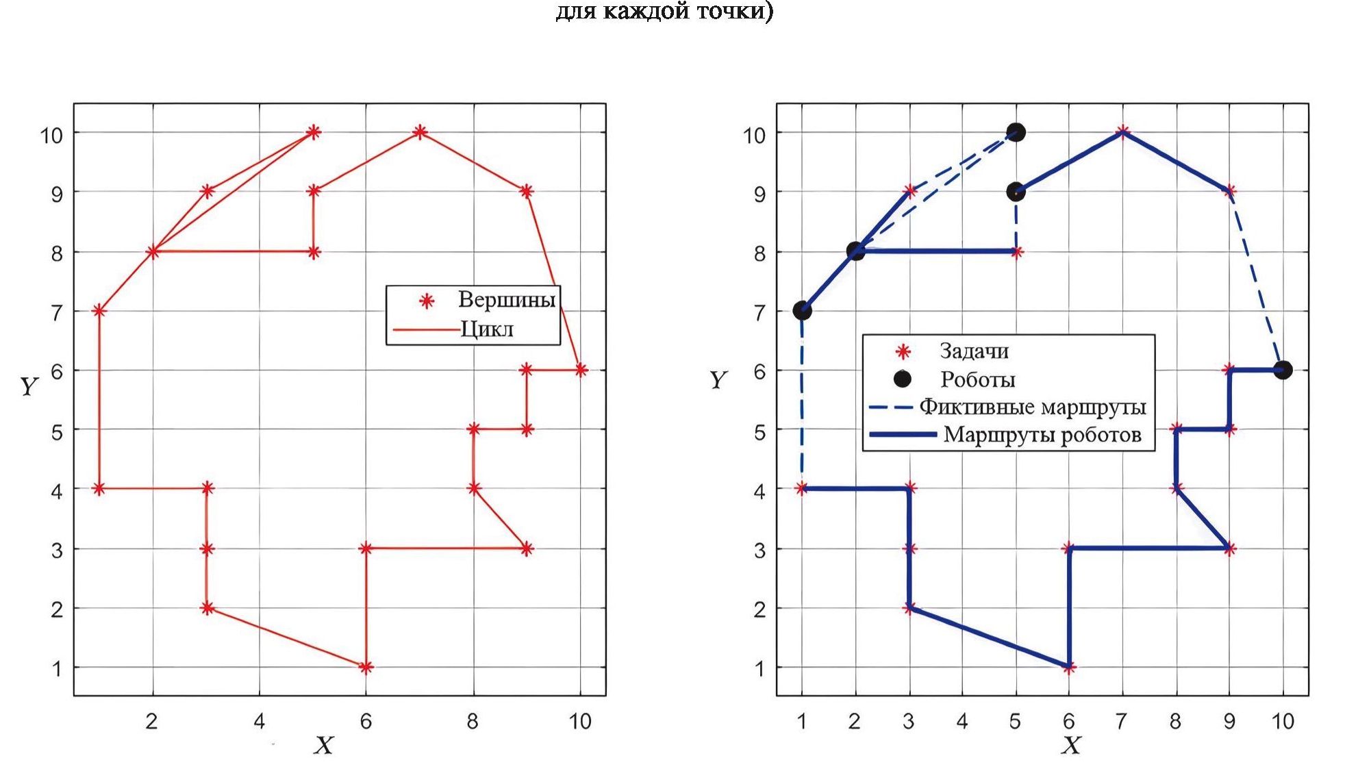Решение NP-полных задач с помощью нейросетевых методов широко практикуется для задач TSP-класса [19]. Для преобразования исходной задачи к задаче TSP-класса введем фиктивные переходы между заданиями и работами на поле, а также между точками расположения роботов с нулевым весом. В конечной точке траектории i-го робота необходимо замкнуть его маршрут через фиктивный путь i+1 робота. При этом вершину маршрута последнего робота N необходимо замкнуть на вершину первого робота (N = 1). Это позволяет построить граф, содержащий гамильтонов цикл, являющийся одним из вероятных решений.