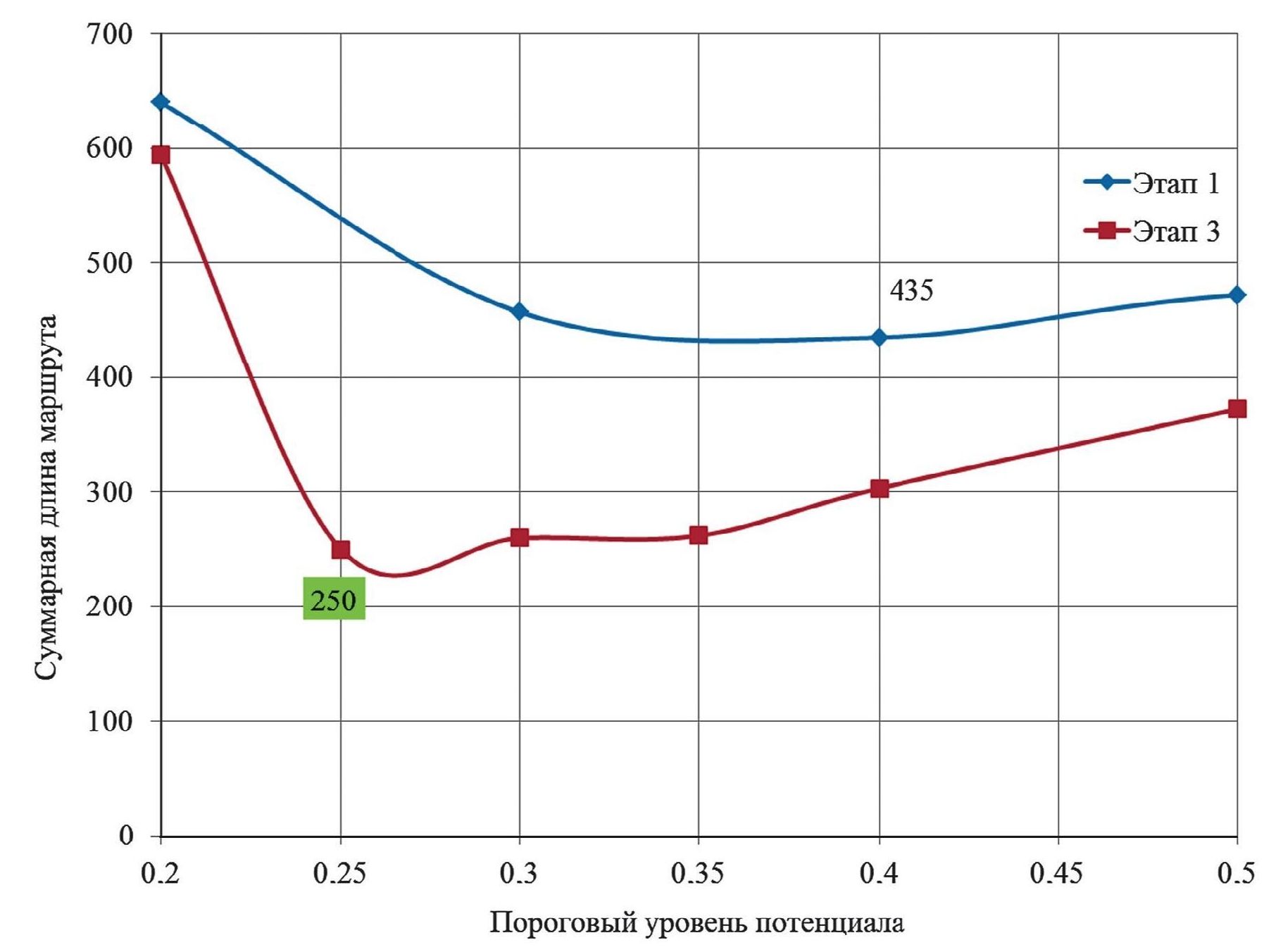Рис. 6. Зависимость минимальной длины маршрута от порогового уровня потенциала (250 запусков нейросети для каждой точки)