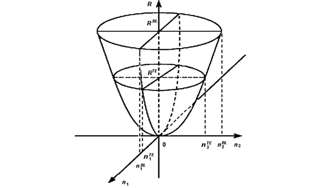 - Анализ полученных результатов. Согласно каноническому уравнению параболоида по формуле (2.1), параметры тяги ТРДД в полете должны иметь соотношения: при n2 = 0 требуется, чтобы RBL = J1·(n1BL)2, где J1 = RBL/(n1BL)2; при n1 = 0 требуется, чтобы RBL = J2·(n2BL)2, где J2 = RBL/(n2BL)2. Причем n1BL и n2BL – это координаты точек на полуосях эллипса при n1 = n1BL и n2 = n2BL, а R = J1(n1BL)2 + J2(n2BL)2, что соответствует точке с координатами (n1BL, n2BL) на плоскости (n1–0–n2), как показано на рис. 2 и 4 при n1 = n1BL и n2 = n2BL.