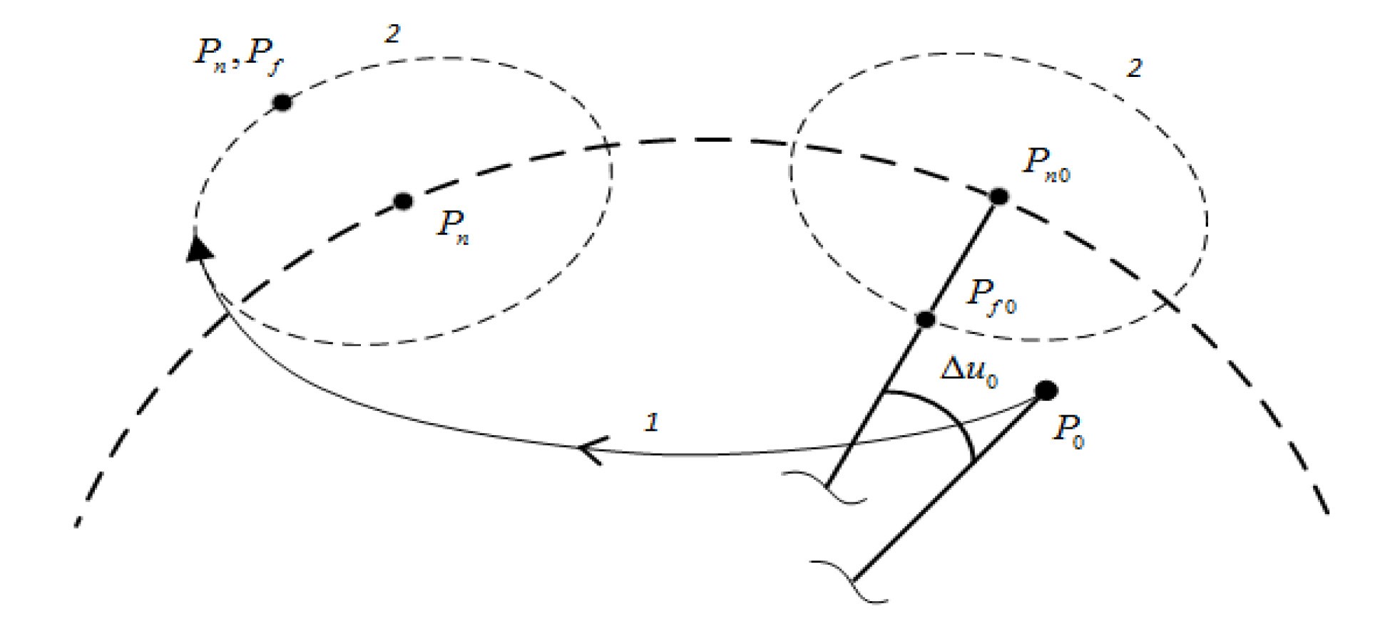 1. Постановка задачи. Предлагаемая схема сближения КТС с НКО представлена на рис. 1, где P0, Pn0, Pf 0 – начальные положения активного КА, НКО и фиктивной точки, с которой совмещается КА при его переходе на эллипс относительного движения; , , Pf – соответственно их конечные положения после окончания перехода; 1 – траектория перехода КА; 2 – эллипс относительного движения КА; u0 – угол, который определяет положение КА относительно НКО в момент начала его перехода на эллипс относительного движения. Угол u0 выбирается в процессе решения задачи, причем, как будет показано ниже, от его значения при прочих равных условиях (параметров орбиты КА) зависят затраты на управление при переходе КА на эллипс относительно движения. На рис. 1 показана одна из возможных схем сближения КТС с НКО, использующая принцип перемещения активного КА по эллипсу относительного движения. Как следует из рис. 1, активный КА имеет более низкую орбиту по сравнению с орбитой НКО. Очевидно, что аналогичная схема сближения КА с НКО может быть построена в случае, когда КА имеет более высокую орбиту по сравнению с орбитой НКО. Кроме того, в рамках каждой из этих схем возможны два варианта, которые отличаются направлением выпуска троса с УЗ: вниз или вверх относительно местной вертикали, построенной относительно КА. Причем эти варианты отличаются направлением сближения УЗ с НКО. Ниже будет подробно рассмотрена схема, изображенная на рис. 1, и оба варианта сближения УЗ и НКО (выпуск троса вниз и вверх).