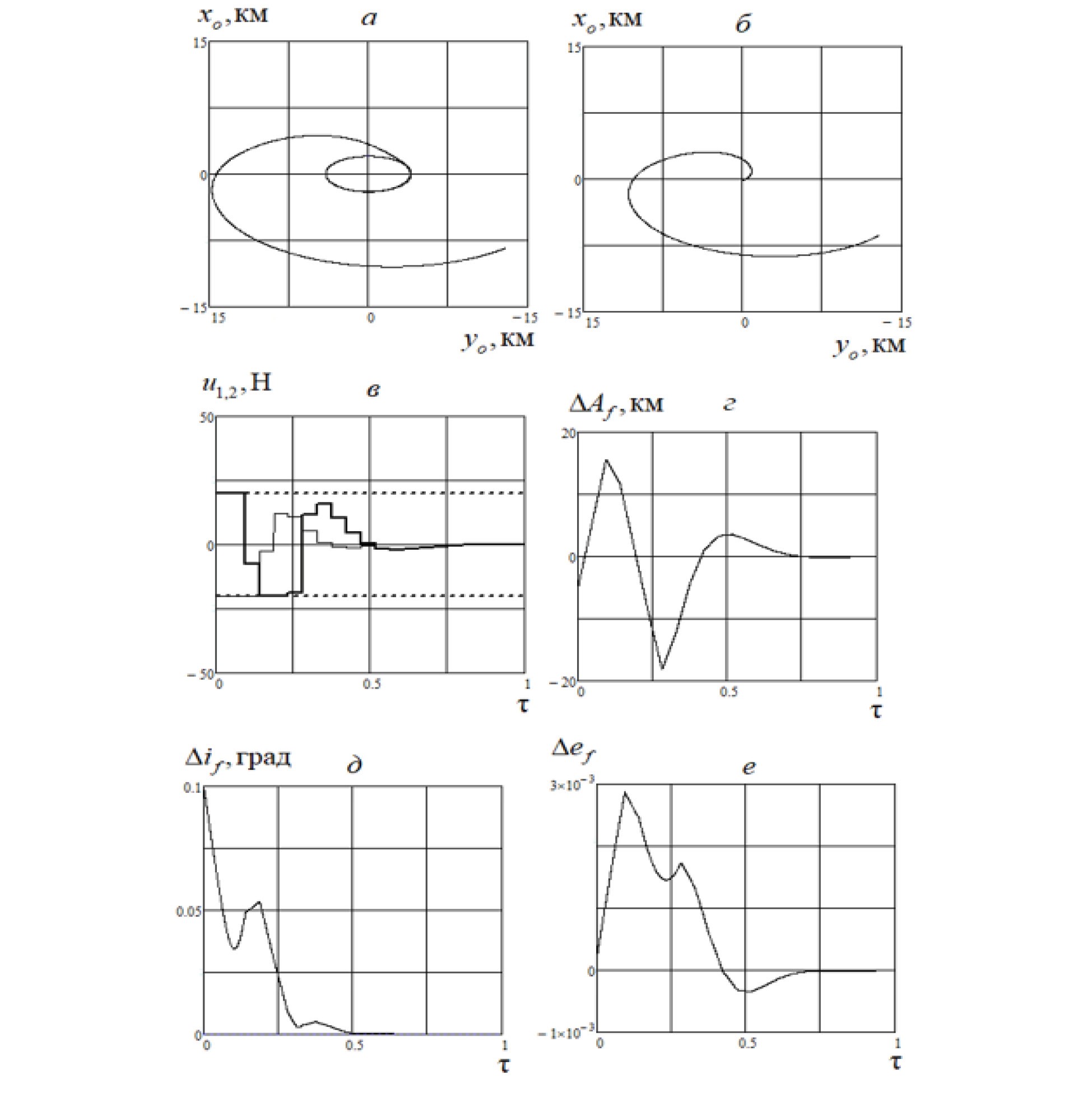 Следует отметить, что управление здесь осуществляется в соответствии с принципом обратной связи по конечному состоянию (совмещение координат и скоростей КА с координатами и скоростями фиктивной точки). В процессе решения задачи находится положительно-определенная функция , которая является функцией Ляпунова для рассматриваемой задачи. В этом случае любые малые возмущения, которые возникают в текущий момент времени, должны компенсироваться в следующий момент времени, так как имеет место сходимость процесса управления. С этой точки зрения следует вернуться к рис. 2е, где показано, что даже значительные отклонения начального положения КА от расчетного не приводят к неустойчивости процесса управления. Естественно, что затраты на управления при этом увеличиваются.