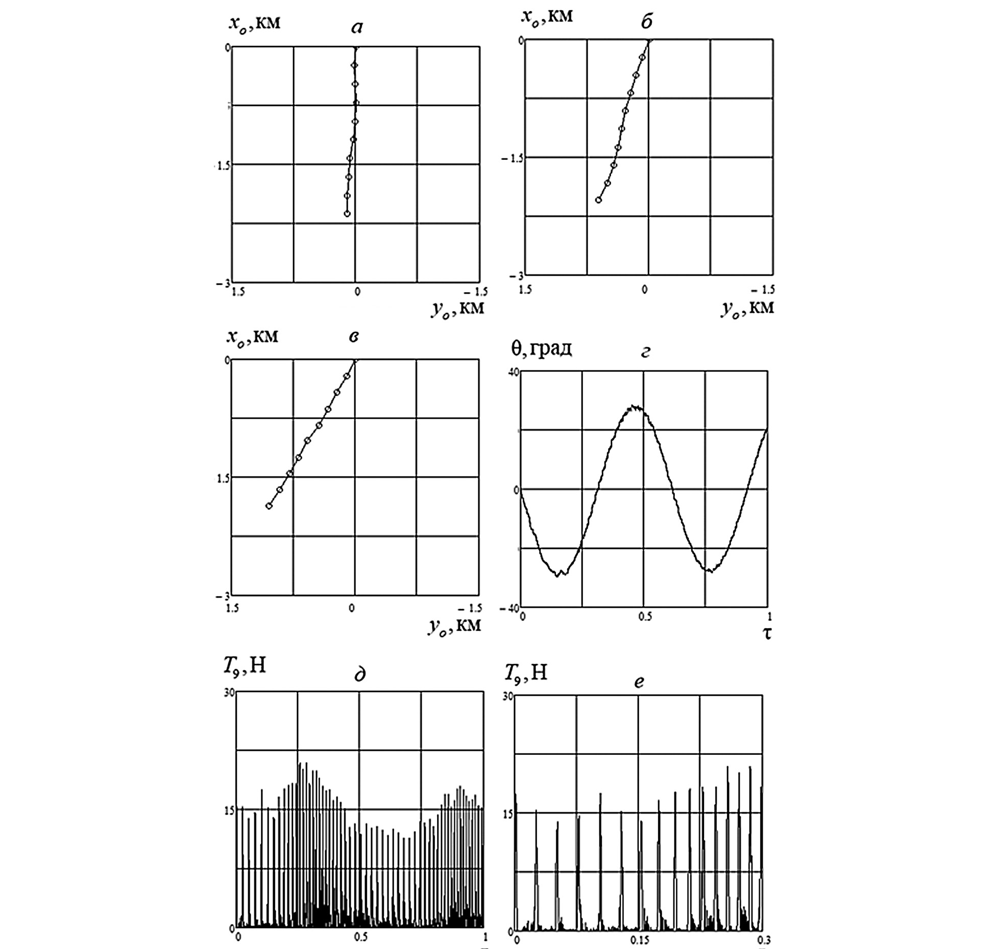 где , – вектор скорости УЗ относительно НКО в момент захвата. Здесь следует отметить, что изменение скорости (6.4) как раз и определяет возмущение, которое действует на КТС в момент захвата НКО. Величина этого возмущения (6.4), очевидно, зависит от скорости относительного сближения УЗ и НКО DV и от отношения масс , причем всегда . Здесь в качестве примера рассмотрим случай, когда , и второй вариант развертывания КТС (рис. 4г–е, УЗ находится снизу). Первый вариант развертывания КТС приводит к аналогичным результатам, так как относительные скорости при захвате НКО для обоих вариантов примерно одинаковые (| DV | = 3.82 м/с, 3.59 м/с). Тогда после захвата НКО имеем = 3.82 м/с. Изменение скорости нижнего концевого тела (УЗ вместе с НКО) приводит к возмущениям в движении КТС. Рис. 5, 6 иллюстрируют поведение КТС после захвата НКО в двух случаях: 1) – свободное движение системы (рис. 5); 2) H – транспортировка НКО (рис. 6). Во втором случае малая тяга активного КА направлена по трансверсали противоположно направлению орбитального движения. Из анализа численных результатов следует, что направления векторов в обоих случаях сближения КТС и НКО практически совпадают с трансверсалью орбитальной системой координат, построенной для орбиты НКО. Однако если для первого варианта (УЗ находится сверху) проекция на трансверcаль , т. е. при захвате верхнее концевое тело (УЗ вместе с НКО) отклоняется противоположно направлению орбитального движения всей системы, то для второго варианта и нижнее концевое тело отклоняется в противоположную сторону. На рис. 5а–в показаны три положения КТС после захвата НКО: 1) рис. 5а – сразу после захвата; 2) рис. 5в – при максимальном отклонении от вертикали; 3) рис. 5б – некоторое промежуточное положение. Рис. 5а–в построены относительно КА (0, 0) в связанной с ним орбитальной системе координат. Возмущение приводит к колебаниям всей системы относительно местной вертикали. На рис. 5г демонстрируется, как изменяется угол отклонения линии, соединяющей крайние точки системы, от вертикали θ. Эти колебания практически симметричны относительно вертикали. При этом возникают как поперечные, так и продольные колебания троса, однако амплитуды этих колебаний ограничены. На рис. 5д, е (в увеличенном масштабе) для примера показано, как изменяется сила натяжения троса T9 между точками 9 и 10. Точка 10 – это концевое тело (УЗ вместе с НКО). Силы натяжения между остальными точками изменяются аналогично. Продольные колебания имеют сложный характер: трос между точками то натягивается, то ослабевает, причем имеют место кратковременные провисания троса (для приведенного отрезка, когда T9 = 0). Если после захвата НКО происходит его транспортировка с помощью двигателя малой тяги, расположенного на активном КА, то имеет место смещение колебаний относительно вертикали (рис. 6а) за счет действия момента силы F1 относительно центра масс всей системы. Здесь в качестве примера рассматривается тяга F1, направленная по трансверсали противоположено движению всей системы по орбите. Высота эллиптической орбиты центра масс системы в среднем уменьшается, в частности, на рис. 6, б показано, как изменяется ее большая полуось (приращение ). Причем колебания между точками системы происходят аналогично предыдущему случаю (рис. 5). В рассмотренных примерах при численном моделировании трос разбива