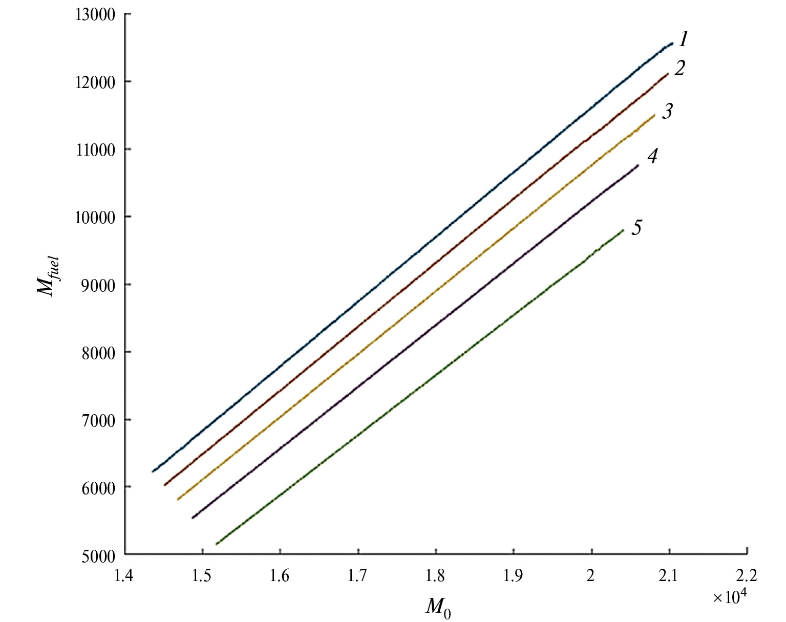 Для расчетов взяты исходные параметры, соответствующие легкому пассажирскому самолету. Результаты расчета по модели 13 представлены на рис. 5, где 1 – детерминированные значения параметров, а 2–5 – уровни вероятности/степени уверенности 0.6, 0.7, 0.8, 0.9.