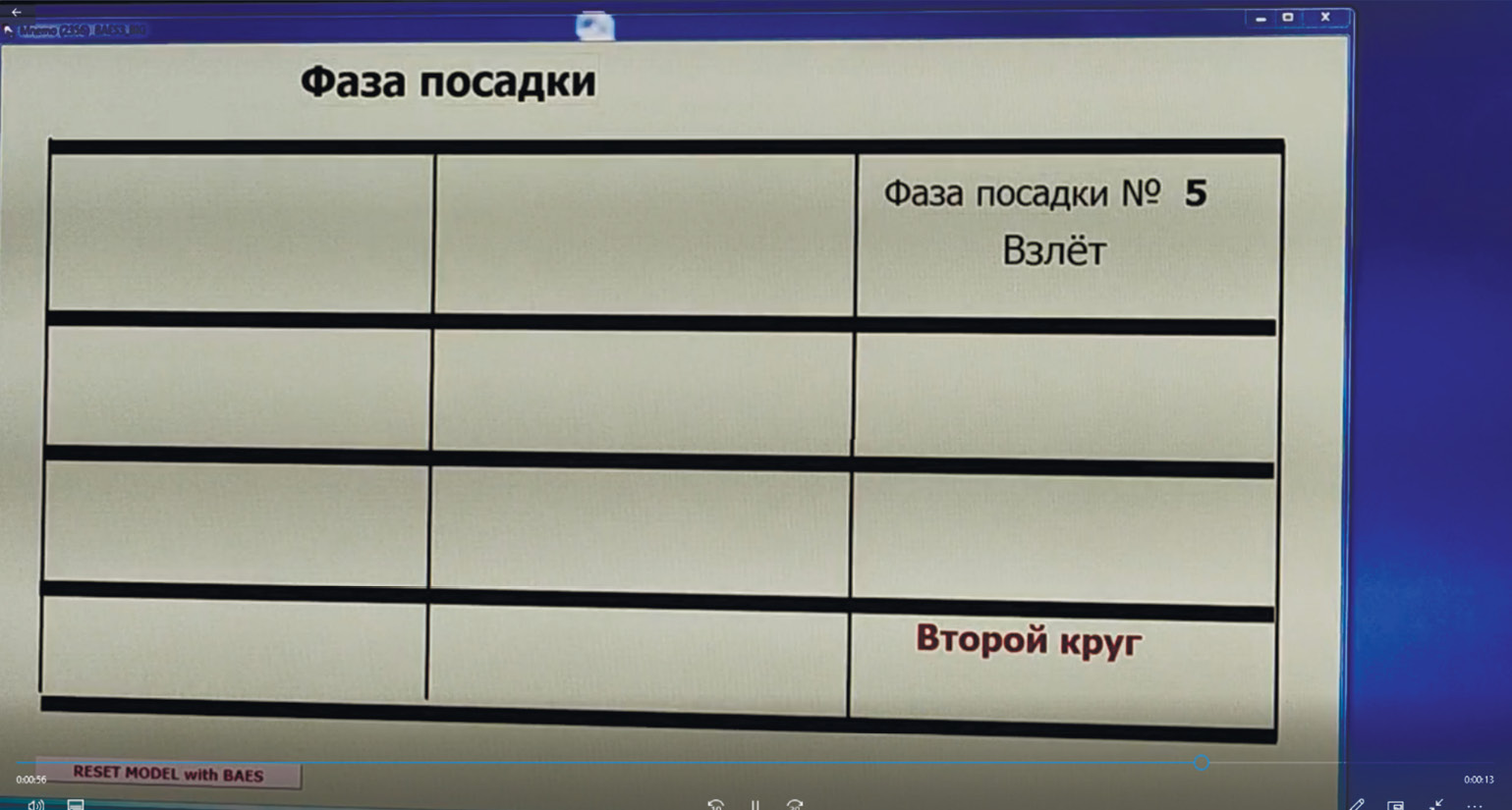 - В этих условия БОСЭС-П (02.2) выступает как действующий демонстрационный образец БОСЭС-П, использующий только штатную бортовую информацию ВС и информацию от курсоглиссадного маяка выбранного аэродрома посадки. Исследовательские испытания БОСЭС-П (02.2) подтвердили работоспособность всех функционирующих в ее базе знаний процедур: решение задачи по прецеденту на фазе посадки № 5 (подтверждая тем самым работоспособность метода решения задач по прецеденту, который также применяется в БОСЭС-П на фазах посадки № 1, 2) и процедур на фазах посадки № 3 и 4, где решение задач базируется на использовании математических моделей пробега ВС по ВПП и логического вывода. Работающая на борту ВС БИС-ТУ, рассчитана на функционирование в условиях, когда из внешних угроз на завершающих фазах посадки ВС появляются только непосредственные угрозы “Попутный ветер” и “Слабое торможение” и упомянутые угрозы могут возникать только на фазах посадки № 3–5.