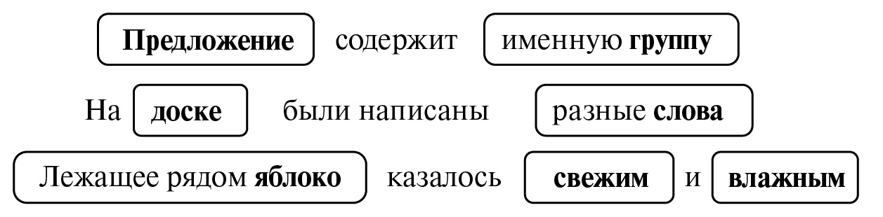 Ряд однородных членов предложения также является цельной именной группой. Пример такого случая продемонстрирован на рис. 5, на котором отдельные именные группы обведены в прямоугольники.