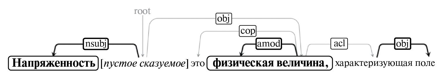 В качестве системы синтаксических ролей часто используется проект UD (universal dependencies) [3], содержащий в том числе универсальную систему синтаксических ролей, которая подходит для более чем 80 естественных языков. Корнем дерева всегда является сказуемое. Пример синтаксического дерева приведен на рис. 3. Именные группы выделены прямоугольниками, слова-вершины именных групп и стрелки синтаксических связей от вершин – жирным шрифтом. Каждая синтаксическая связь снабжена меткой соответствующей синтаксической роли, согласно UD [3].