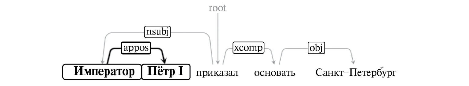 - Именная группа и ее модификатор кореферентны. Пример такого случая приведен на рис. 8. На нем две выделенные именные группы кореферентны, а каждая синтаксическая связь снабжена меткой, соответствующей синтаксической роли, согласно UD [2]: роль appos – модификатор.