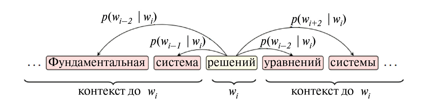 3.3. Векторизация. В работе [28] был предложен метод Word2Vec, породивший направление так называемых векторных представлений. Метод использует алгоритм skig-gram для построения условного распределения текста вокруг токена ws. Контекстом служат n соседних токенов, как изображено на рис. 11, при n = 2, а искомое распределение p(wi +1, wi –1 |wi) задается как произведение p(w |wi).