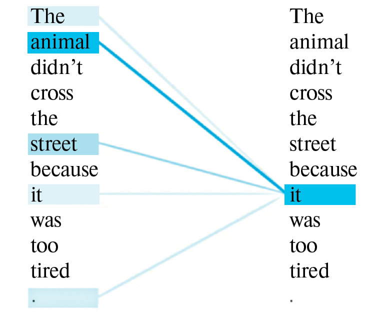 В качестве решения был предложен механизм внимания (attention) [31, 32]. Он позволяет моделям, принимающим и возвращающим последовательности токенов, обращать внимание на определенные элементы входной последовательности. Механизм самовнимания использует одну и ту же последовательность в качестве входной и выходной. Пример работы механизма представлен на рис. 12: для токена “it” строится распределение, где более яркий цвет указывает на элементы, на которые стоит обращать внимание, такие как подлежащее “The animal” и соответствующее сказуемое.