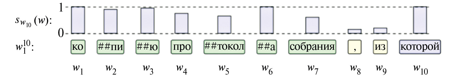 Для вычисления оценок swi(wj) в данной работе используется механизм внимания. Механизм внимания производит распределение вероятности pwi(w) над всей последовательностью w1n. Значение pwi(wj) может быть получено из оценок swi следующим образом: