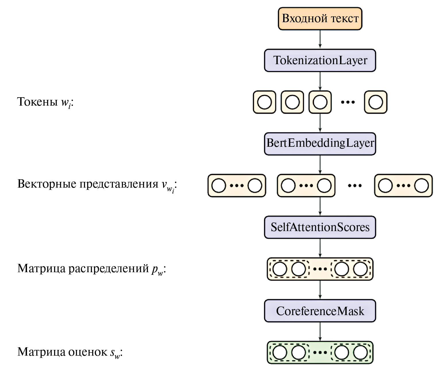 Внутренние представления токенов, используемые при вычислении swi(wj), генерируются при помощи произвольной сторонней рабочей языковой модели. Предполагается, что генерируемые языковыми моделями общего назначения представления токенов содержат достаточно информации для определения кореференции описанным методом.