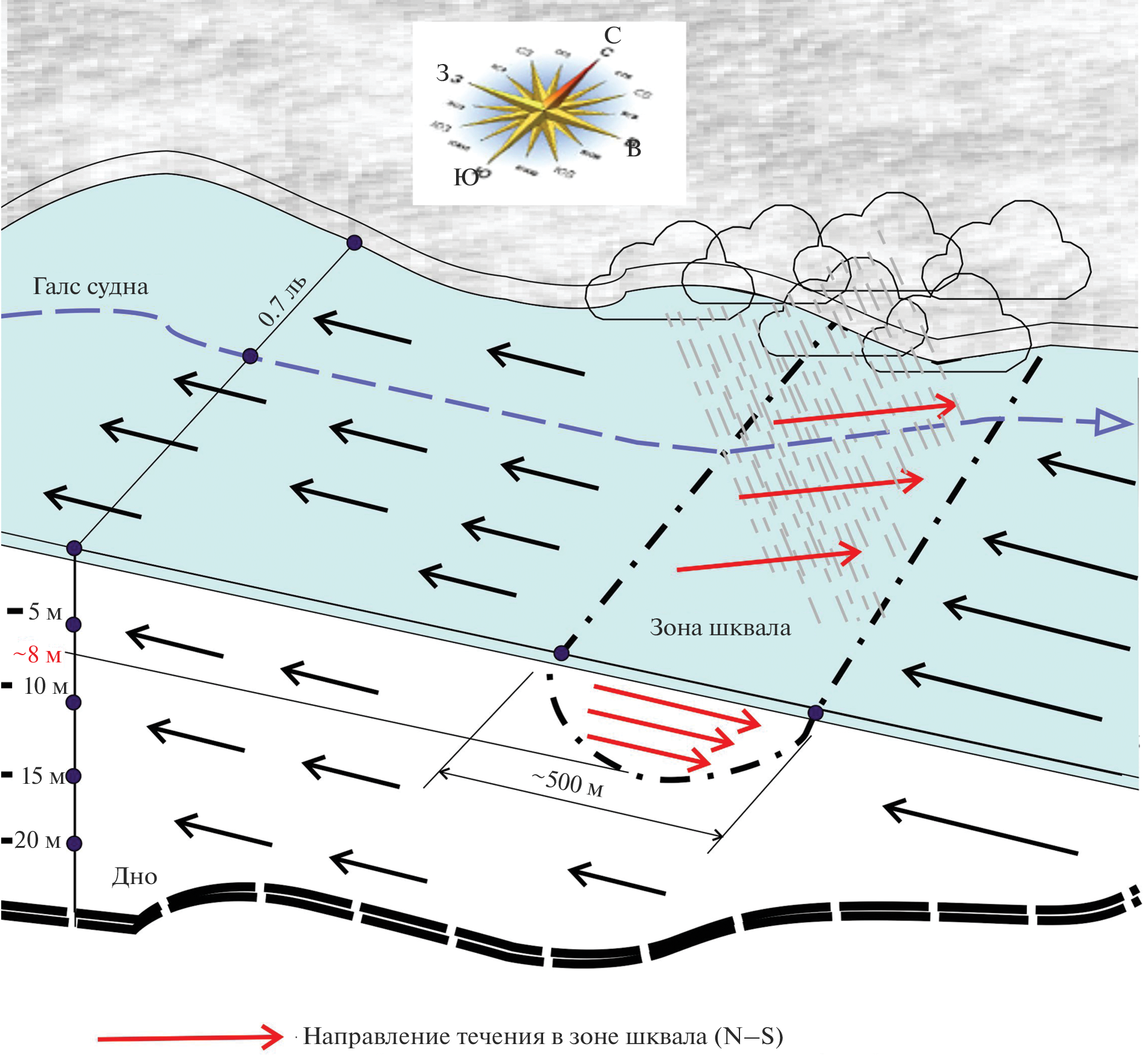 The data of an unusual case of measuring the current that occurred during the passage of a squally wind over the sea are presented. The measurements were carried out on October 12, 2011 in the waters of the Black Sea shelf near Gelendzhik within the boundaries from the Golubaya Bay beam to Cape Tolstoy on a yacht equipped with ADCP “Rio Grande 600 kHz”. An unusual intense subsurface current (up to 1 m/s) was revealed, penetrating 8 m deep, generated by a strong squall that passed over the shelf zone.