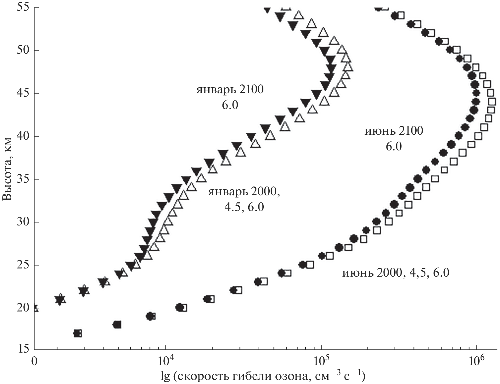 Data on the effect of global warming on the atmospheric lifetime of odd oxygen, Ox. The results obtained characterize the effect at latitude 50°C. in the altitude range of 15–55 km in January–June 2000–2100s, the data for calculations were obtained using the interactive radiation-chemical two-dimensional SOCRATES model, with which the total rate of Ox death in the Ox, HOx, NOx, ClOx and BrOx catalytic cycles, as well as the concentration of Ox equal to the sum of the concentrations of O3, O(3P) and O(1D) for the above conditions, which are necessary for calculating the lifetime of Ox, were preliminarily calculated. Scenarios of the Intergovernmental Panel on Climate Change (IPCC) were used as initial conditions for calculations using the SOCRATES model RCP 4.5 and RCP 6.0 for the above conditions.