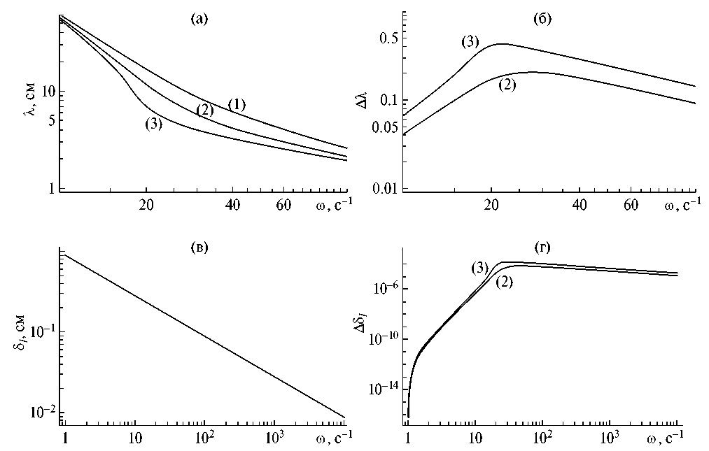 Численные расчеты показывают, что поверхностный электрический заряд оказывает заметное влияние на волновой компонент в области капиллярно-гравитационных волн и не оказывает значимого влияния на лигаменты периодического поверхностного течения. Зависимости длины волны λ и масштаба лигамента δi от частоты ω, при разных значениях параметра W, приведены на рис. 2а и в, соответственно. Зависимости относительного изменения длины волны и масштаба лигамента на незаряженной (λ и δl) и заряженной (λW и δlW) поверхности от частоты ω показаны на рис. 2б и 2г соответственно.