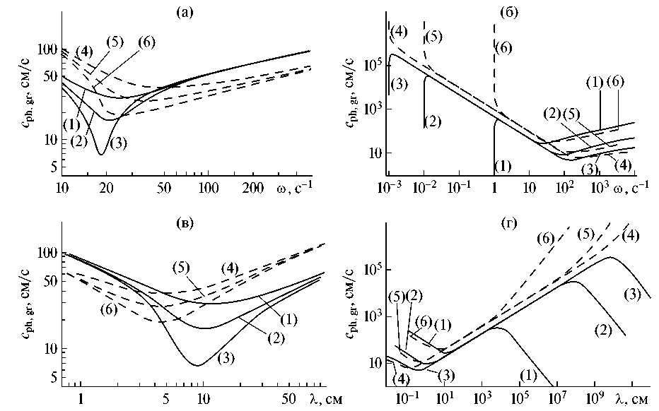 Рис. 3. Графики групповых (сплошные линии) и фазовых (пунктирные линии) скоростей волн: а, б – в зависимости от частоты ω, параметры (N, c–1, W) для кривых 1–6 на (а): (1; 0), (1; 1); (1; 1.5); (1; 0), (1; 1); (1; 1.5); для кривых 1–6 на (б): (1; 0), (0.01; 0); (0.001; 0); (1; 0), (0.01; 0); (0.001; 0); в, г в зависимости от длины волны λ; параметры (N, c–1, W) для кривых 1–6 на (в): (1; 0), (1; 1); (1; 1.5); (1; 0), (1; 1); (1; 1.5), для кривых 1–6 на (г): (1; 0), (0.01; 0); (0.001; 0); (1; 0), (0.01; 0); (0.001; 0) соответственно.