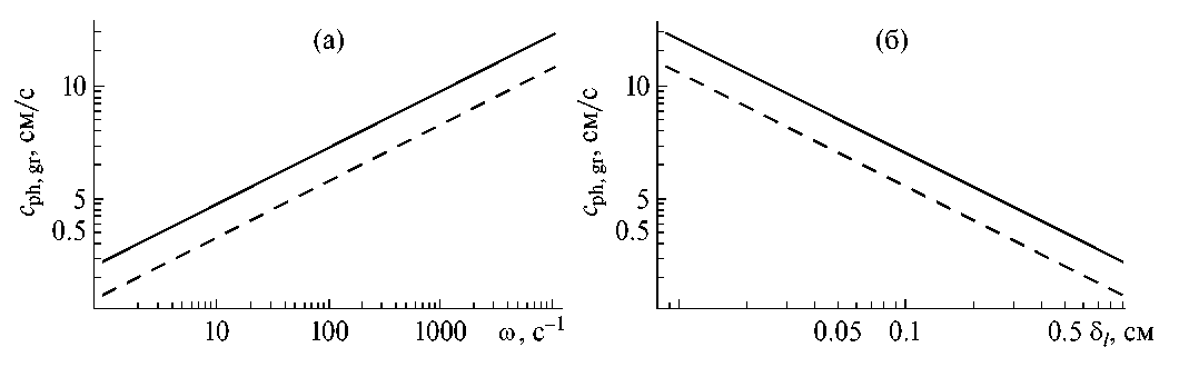 Рис. 4. Зависимости групповых и фазовых скоростей лигаментного компонента периодического течения в сильно стратифицированной жидкости, N=1c–1, с параметрами воды: а – от частоты ω; б – от масштаба лигамента δl.